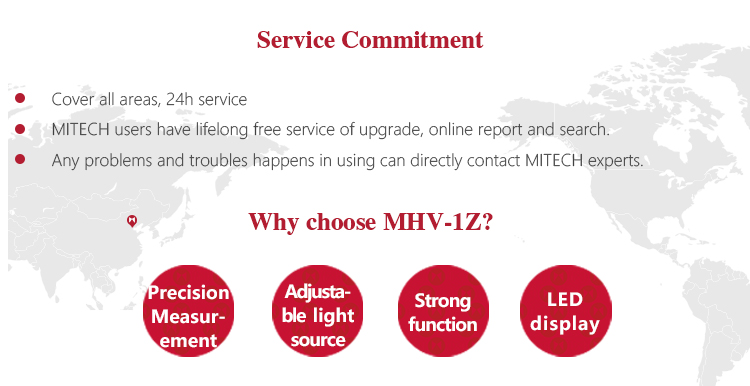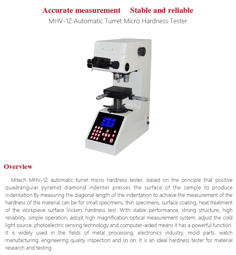 Mitech MHV-1Z automatic turret micro hardness tester, based on the principle that positive quadrangular pyramid diamond indenter presses the surface of the sample to produce indentation.By measuring the diagonal length of the indentation to achieve the measurement of the hardness of the material can be for small specimens, thin specimens, surface coating, heat treatment of the workpiece surface Vickers hardness test. With stable performance, strong structure, high reliability, simple operation, adopt high magnification optical measurement system, adjust the cold light source, photoelectric sensing technology and computer-aided means it has a powerful function. It is widely used in the fields of metal processing, electronics industry, mold parts, watch manufacturing, engineering quality inspection and so on. It is an ideal hardness tester for material research and testing.