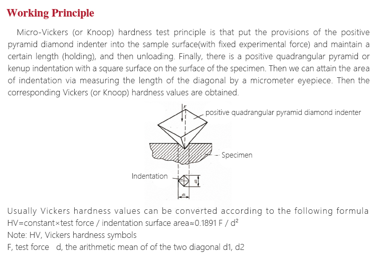 Micro-Vickers (or Knoop) hardness test principle is that put the provisions of the positive pyramid diamond indenter into the sample surface(with fixed experimental force) and maintain a certain length (holding), and then unloading. Finally, there is a positive quadrangular pyramid or kenup indentation with a square surface on the surface of the specimen. Then we can attain the area of indentation via measuring the length of the diagonal by a micrometer eyepiece. Then the corresponding Vickers (or Knoop) hardness values are obtained.