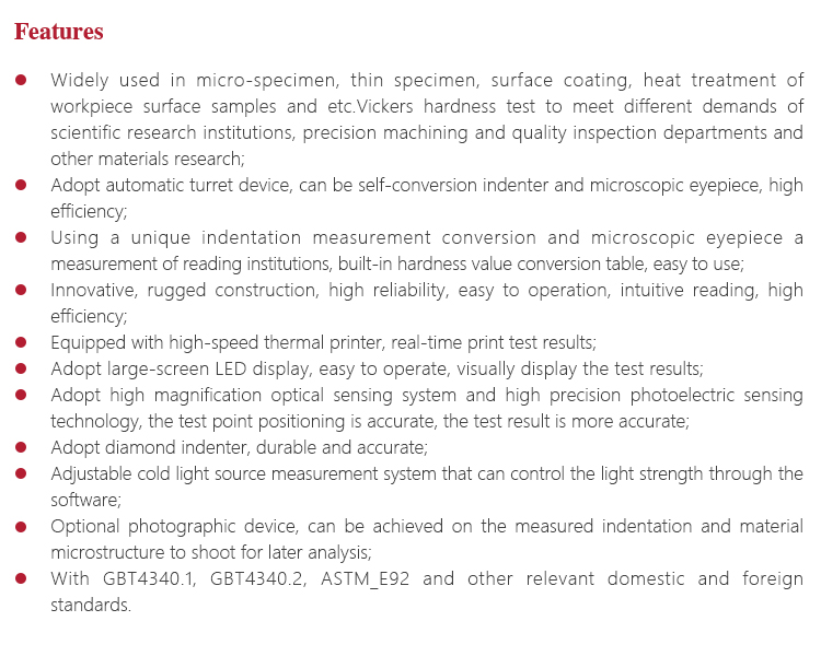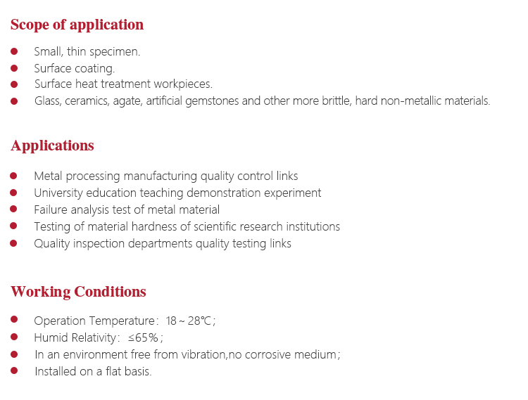 Widely used in micro-specimen, thin specimen, surface coating, heat treatment of workpiece surface samples and etc.Vickers hardness test to meet different demands of scientific research institutions, precision machining and quality inspection departments and other materials research;