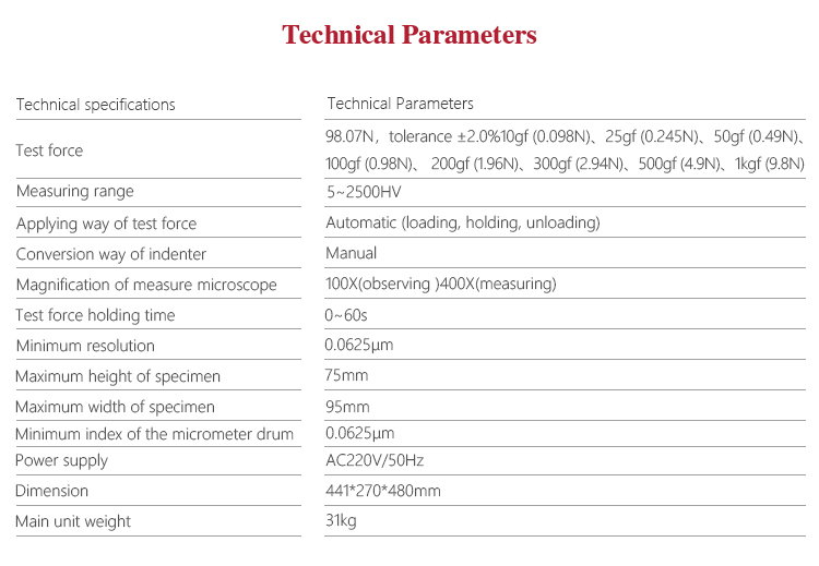 Test force | 98.07N,tolerance ±2.0%10gf (0.098N)、25gf (0.245N)、50gf (0.49N)、100gf (0.98N)、 200gf (1.96N)、300gf ( |