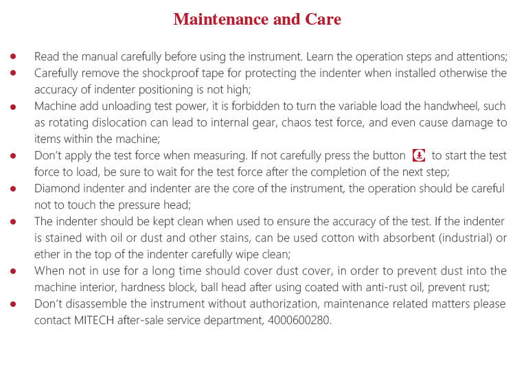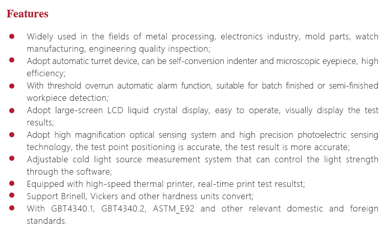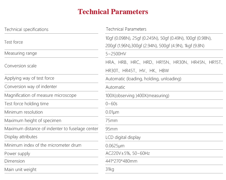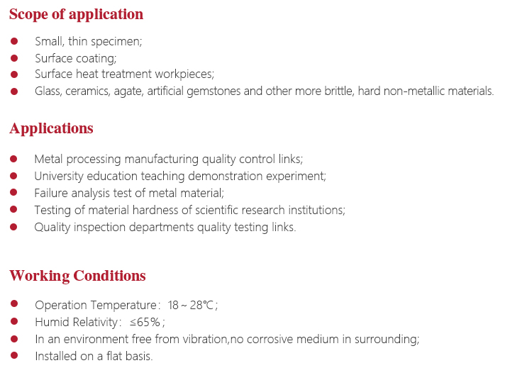 Micro-Vickers (or Knoop) hardness test principle is that put the provisions of the positive pyramid diamond indenter into the sample surface(with fixed experimental force) and maintain a certain length (holding), and then unloading. Finally, there is a positive quadrangular pyramid or kenup indentation with a square surface on the surface of the specimen. Then we can attain the area of indentation via measuring the length of the diagonal by a micrometer eyepiece. Then the corresponding Vickers (or Knoop) hardness values are obtained.