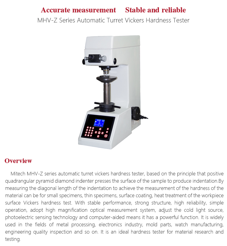 Mitech MHV-Z series automatic turret vickers hardness tester, based on the principle that positive quadrangular pyramid diamond indenter presses the surface of the sample to produce indentation.By measuring the diagonal length of the indentation to achieve the measurement of the hardness of the material can be for small specimens, thin specimens, surface coating, heat treatment of the workpiece surface Vickers hardness test. With stable performance, strong structure, high reliability, simple operation, adopt high magnification optical measurement system, adjust the cold light source, photoelectric sensing technology and computer-aided means it has a powerful function. It is widely used in the fields of metal processing, electronics industry, mold parts, watch manufacturing, engineering quality inspection and so on. It is an ideal hardness tester for material research and testing