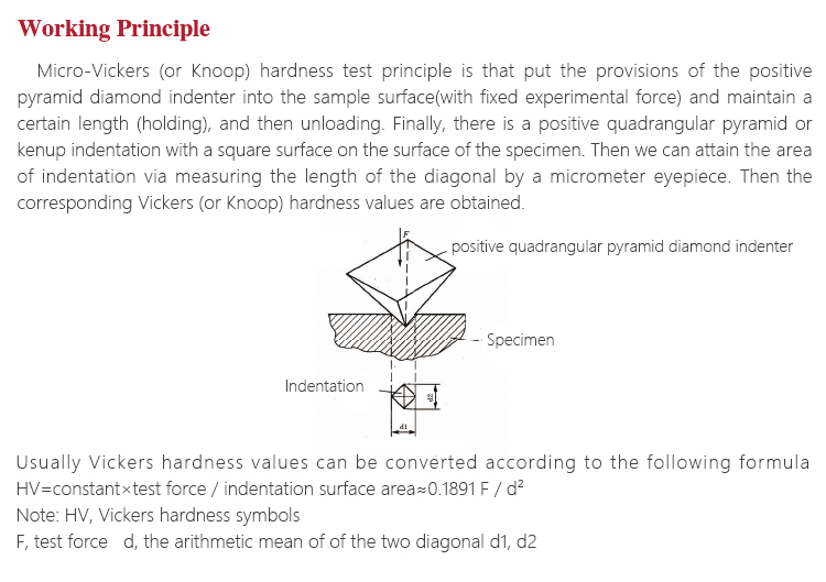 Micro-Vickers (or Knoop) hardness test principle is that put the provisions of the positive pyramid diamond indenter into the sample surface(with fixed experimental force) and maintain a certain length (holding), and then unloading. Finally, there is a positive quadrangular pyramid or kenup indentation with a square surface on the surface of the specimen. Then we can attain the area of indentation via measuring the length of the diagonal by a micrometer eyepiece. Then the corresponding Vickers (or Knoop) hardness values are obtained.