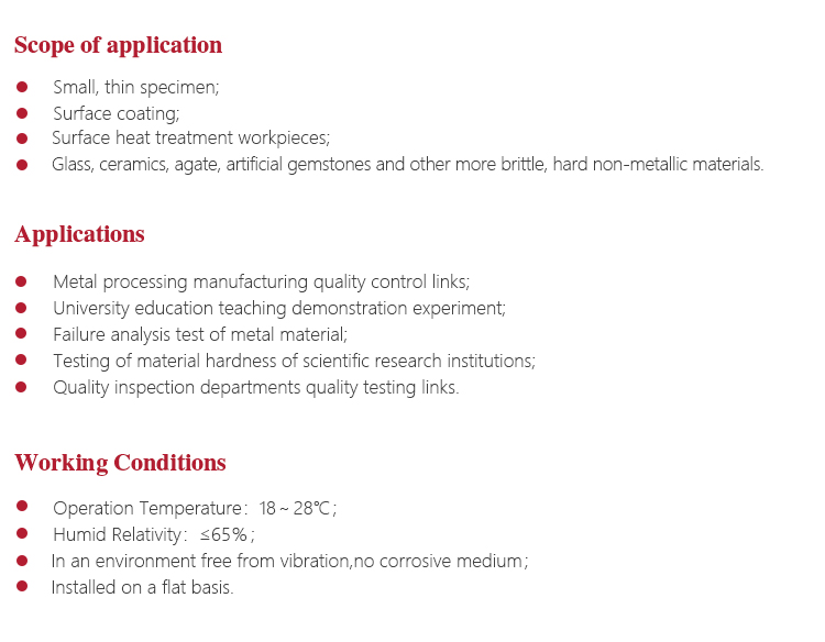 Widely used in micro-specimen, thin specimen, surface coating, heat treatment of workpiece surface samples and etc.Vickers hardness test to meet different demands of scientific research institutions, precision machining and quality inspection departments and other materials research;
