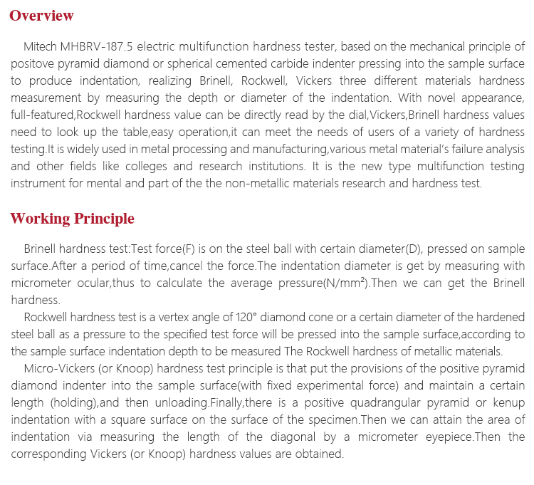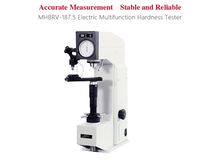 Mitech MHBRV-187.5 electric multifunctional hardness tester, based on the mechanical principle of positive pyramid diamond or spherical cemented carbide indenter pressing into the sample surface to produce indentation, realizing Brinell, Rockwell, Vickers three different materials hardness measurement by measuring the depth or diameter of the indentation. With novel appearance, full-featured, Rockwell hardness value can be directly read by the dial, Vickers, Brinell hardness values need to look up the table, easy operation, it can meet the needs of users of a variety of hardness testing. It is widely used in metal processing and manufacturing, various metal material’s failure analysis and other fields like colleges and research institutions. It is the new type multifunctional testing instrument for mental and part of the the non-metallic materials research and hardness test.