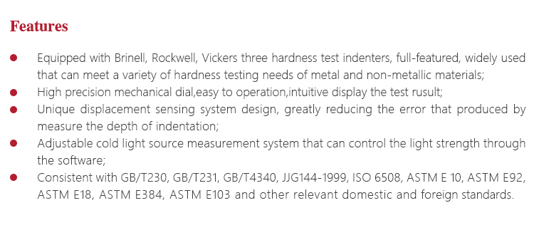l Equipped with Brinell, Rockwell, Vickers three hardness test indenter, full-featured, widely used that can meet a variety of hardness testing needs of metal and non-metallic materials;