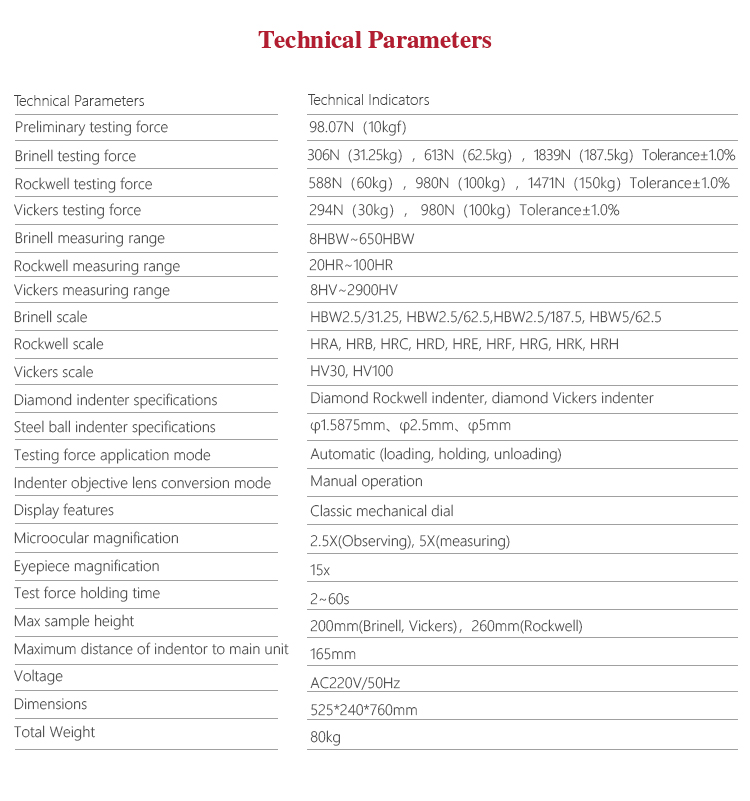 Brinell testing force | 306N(31.25kg),613N(62.5kg),1839N(187.5kg)Tolerance±1.0% |