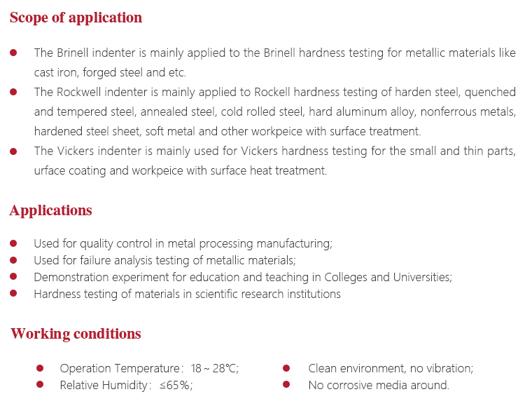 l Consistent with GB/T230, GB/T231, GB/T4340, JJG144-1999, ISO 6508, ASTM E 10, ASTM E92, ASTM E18, ASTM E384, ASTM E103 and other relevant domestic and foreign standards.
