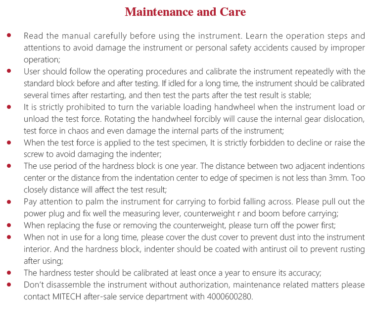 l When not in use for a long time, please cover the dust cover to prevent dust into the instrument interior. And the hardness block, indenter should be coated with antirust oil to prevent rusting after using.