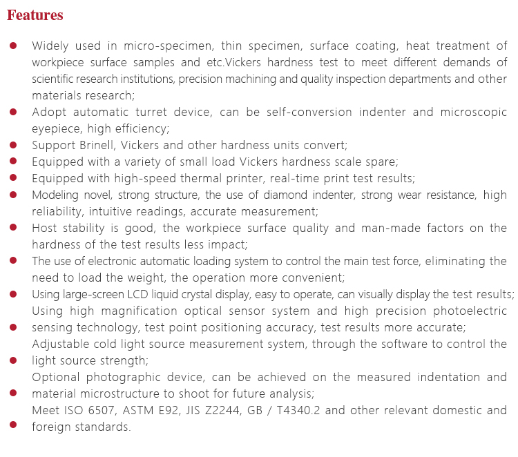 Widely used in micro-specimen, thin specimen, surface coating, heat treatment of workpiece surface samples and etc.Vickers hardness test to meet different demands of scientific research institutions, precision machining and quality inspection departments and other materials research;