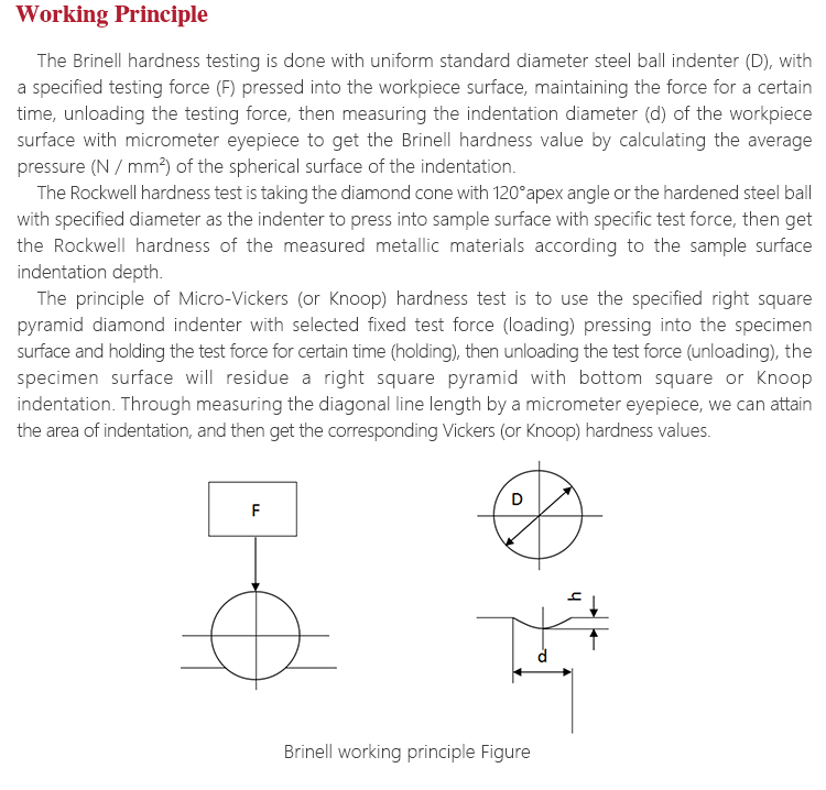 Brinell hardness test: Test force(F) is on the steel ball with certain diameter(D) , pressed on sample surface. After a period of time, cancel the force. The indentation diameter is get by measuring with micrometer ocular,thus to calculate the average pressure(N/mm2).Then we can get the Brinell hardness.