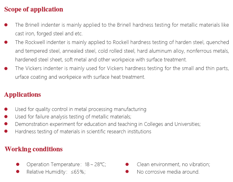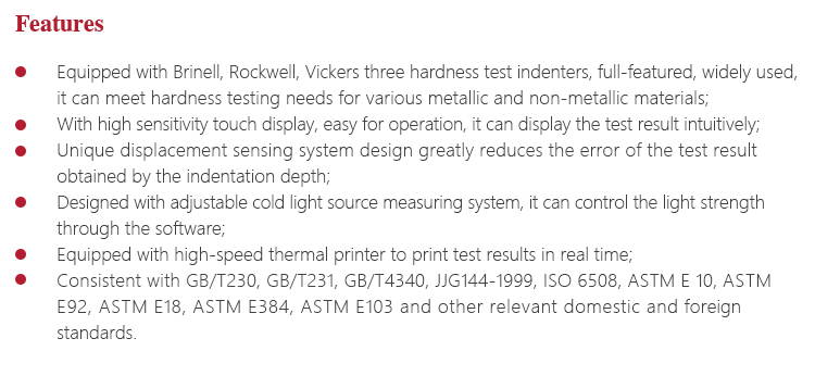 or spherical cemented carbide indenter pressing into the sample surface to produce indentation, realizing Brinell, Rockwell, Vickers three different materials hardness measurement by measuring the depth or diameter of the indentation. With novel appearance, full-featured, high sensitivity touch screen design, equipped with embedded operating system, simple