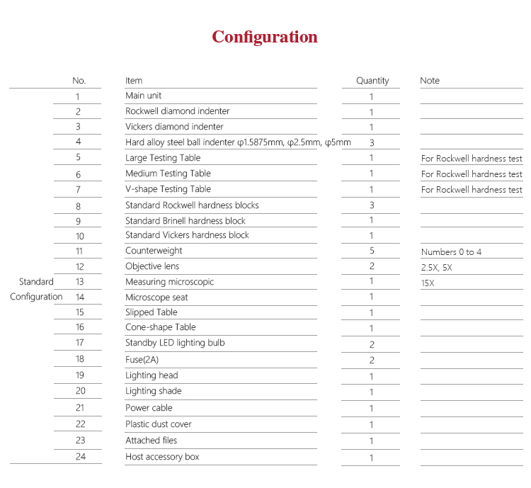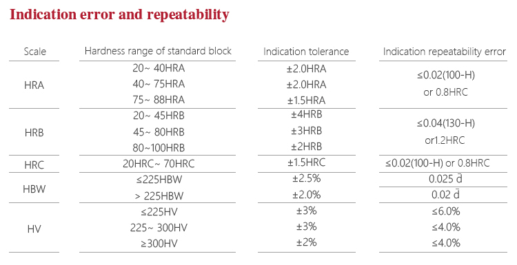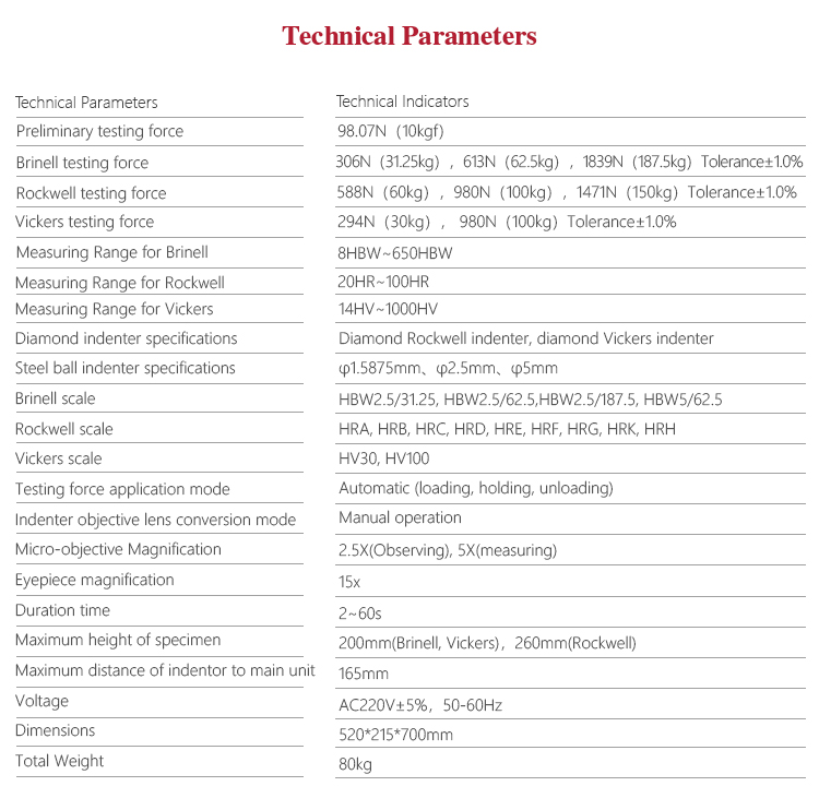 Brinell testing force | 306N(31.25kg),613N(62.5kg),1839N(187.5kg)Tolerance±1.0% |