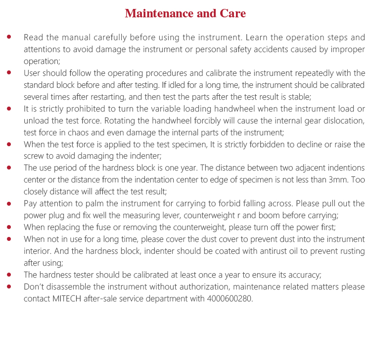l When not in use for a long time, please cover the dust cover to prevent dust into the instrument interior. And the hardness block, indenter should be coated with antirust oil to prevent rusting after using.