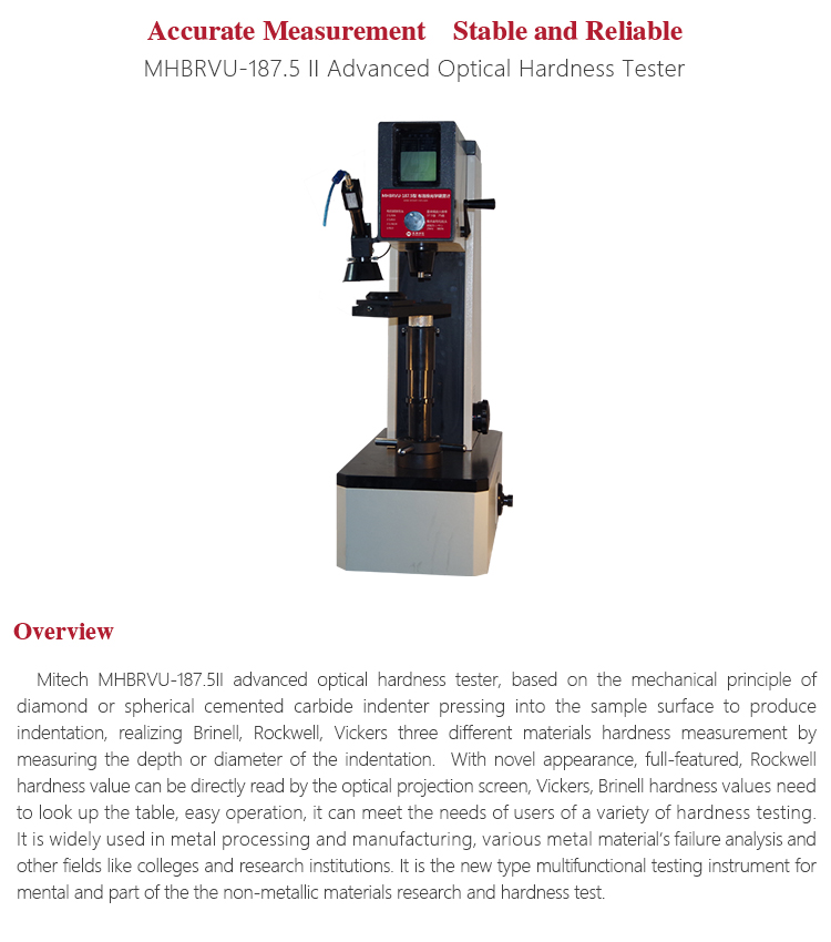 Mitech MHBRVU-187.5II advanced optical hardness tester, based on the mechanical principle of diamond or spherical cemented carbide indenter pressing into the sample surface to produce indentation, realizing Brinell, Rockwell, Vickers three different materials hardness measurement by measuring the depth or diameter of the indentation. With novel appearance, full-featured, Rockwell hardness value can be directly read by the optical projection screen, Vickers, Brinell hardness values need to look up the table, easy operation, it can meet the needs of users of a variety of hardness testing. It is widely used in metal processing and manufacturing, various metal material’s failure analysis and other fields like colleges and research institutions. It is the new type multifunctional testing instrument for mental and part of the the non-metallic materials research and hardness test.