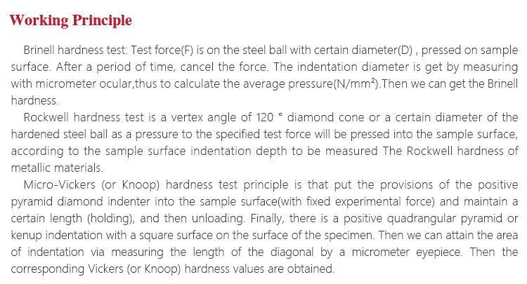Micro-Vickers (or Knoop) hardness test principle is that put the provisions of the positive pyramid diamond indenter into the sample surface(with fixed experimental force) and maintain a certain length (holding), and then unloading. Finally, there is a positive quadrangular pyramid or kenup indentation with a square surface on the surface of the specimen. Then we can attain the area of indentation via measuring the length of the diagonal by a micrometer eyepiece. Then the corresponding Vickers (or Knoop) hardness values are obtained.