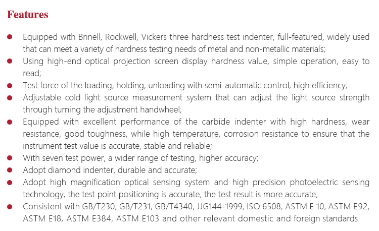 l Equipped with Brinell, Rockwell, Vickers three hardness test indenter, full-featured, widely used that can meet a variety of hardness testing needs of metal and non-metallic materials;