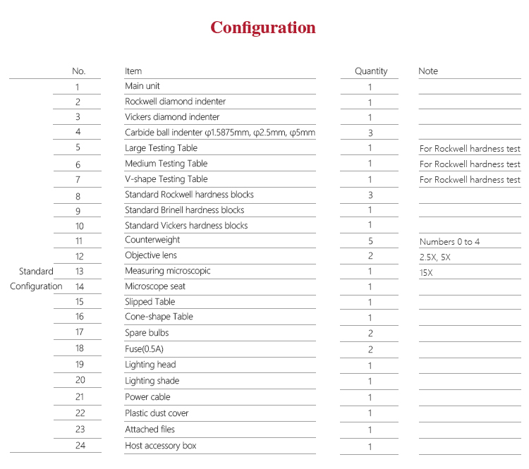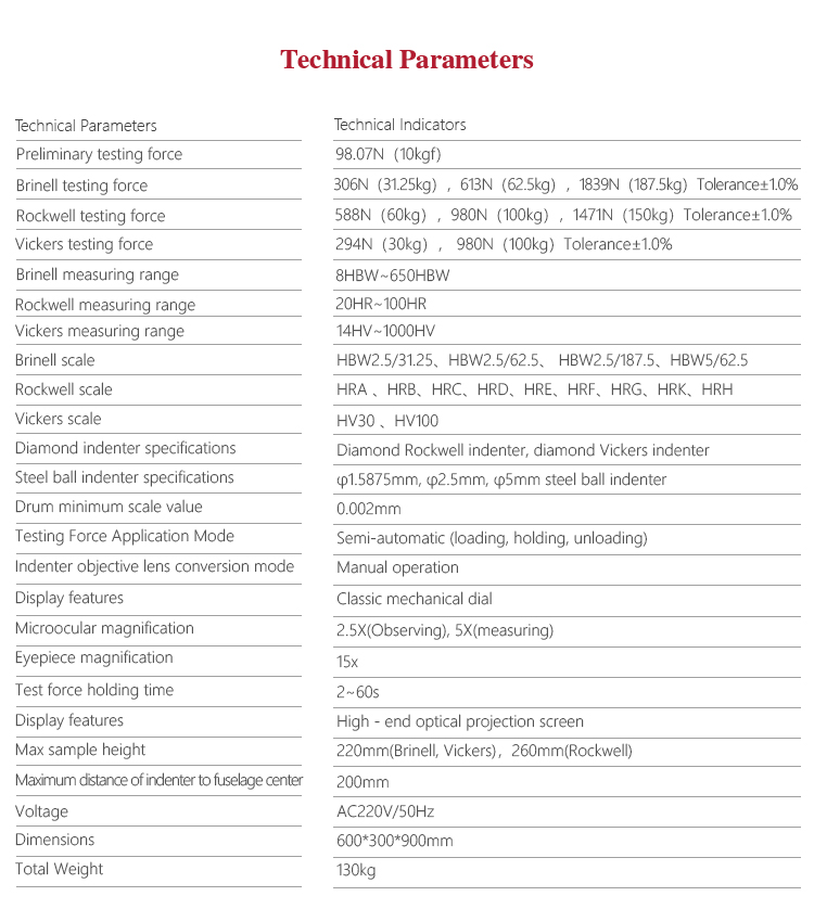 Brinell testing force | 306N(31.25kg),613N(62.5kg),1839N(187.5kg)Tolerance±1.0% |