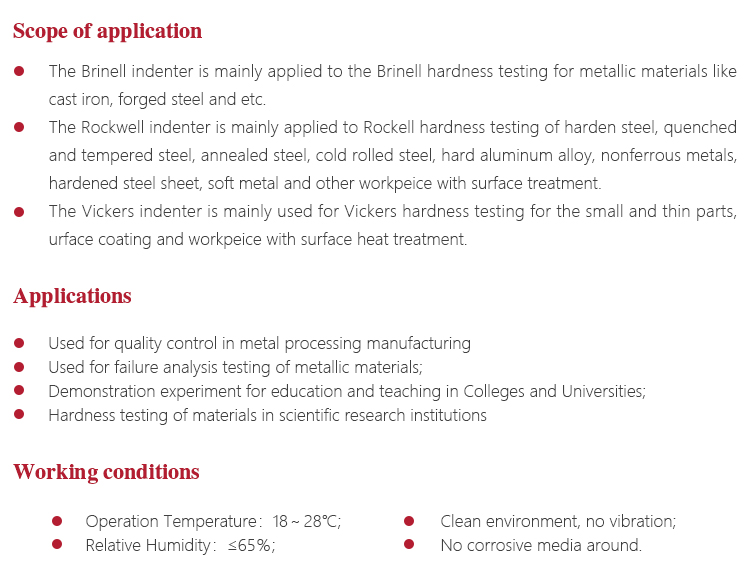 l Equipped with excellent performance of the carbide indenter with high hardness, wear resistance, good toughness, while high temperature, corrosion resistance to ensure that the instrument test value is accurate, stable and reliable;