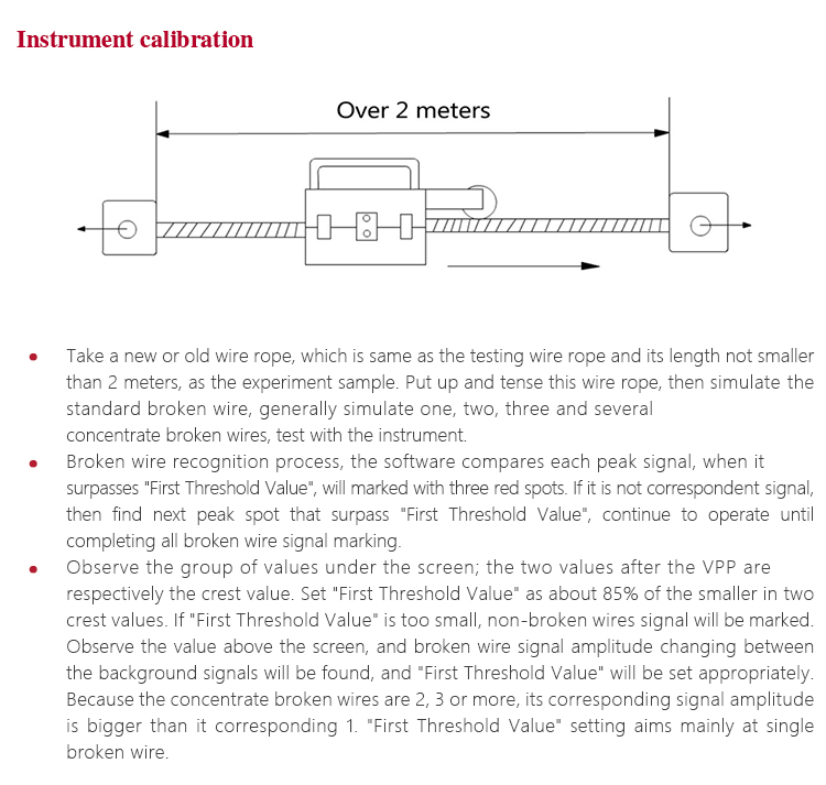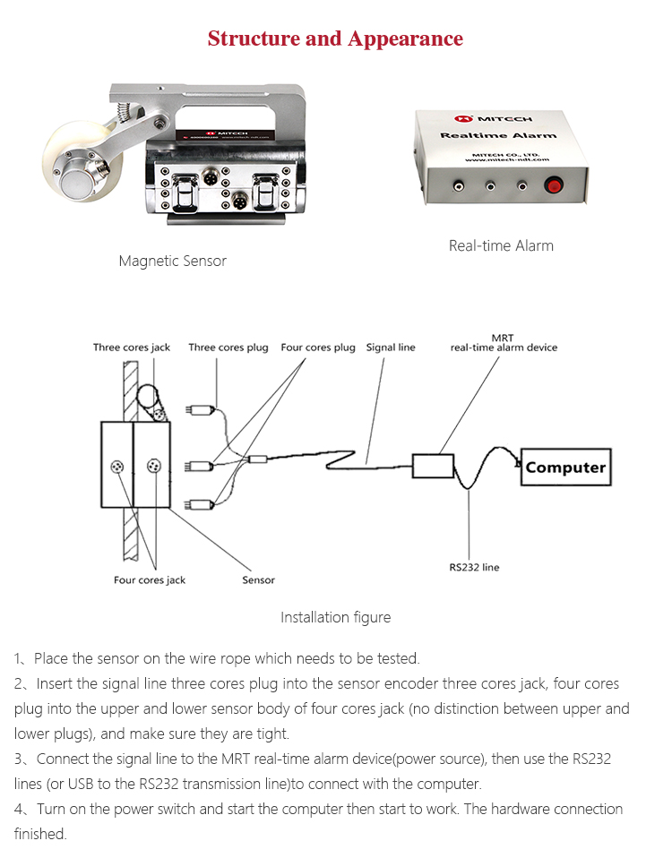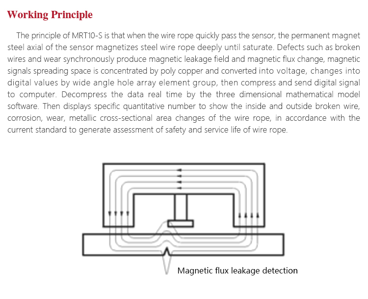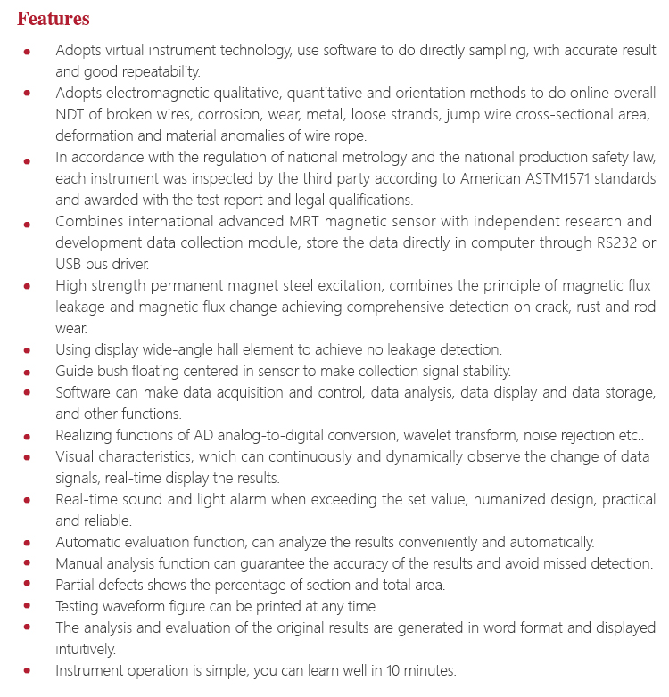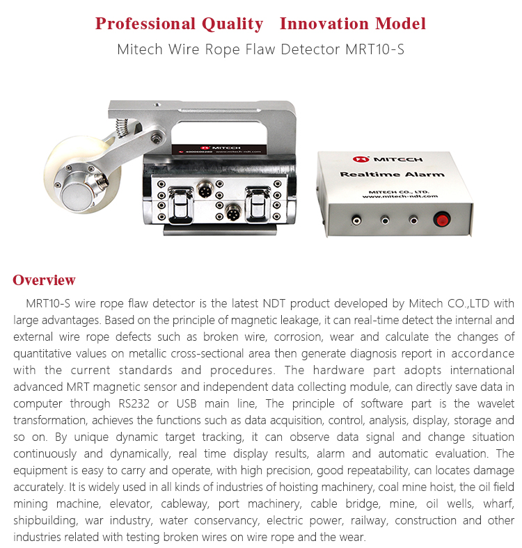 MRT10-S wire rope flaw detector is the latest NDT product developed by Mitech CO.,LTD. Based on the principle of magnetic leakage, it can real-time detect the internal and external wire rope defects such as broken wire, corrosion, wear and calculate the changes of quantitative values on metallic cross-sectional area then generate diagnosis report in accordance with the current standards and procedures. The hardware part adopts international advanced MRT magnetic sensor and independent data collecting module, can directly save data in computer through RS232 or USB main line, The principle of software part is the wavelet transformation, achieves the functions such as data acquisition, control, analysis, display, storage and so on. By unique dynamic target tracking, it can observe data signal and change situation continuously and dynamically, real time display results, alarm and automatic evaluation. The equipment is easy to carry and operate, with high precision, good repeatability, can locate damage accurately. It is widely used in all kinds of industries of hoisting machinery, coal mine hoist, the oil field mining machine, elevator, cableway, port machinery, cable bridge, mine, oil wells, wharf, shipbuilding, war industry, water conservancy, electric power, railway, construction and other industries related with testing broken wires on wire rope and the wear.
