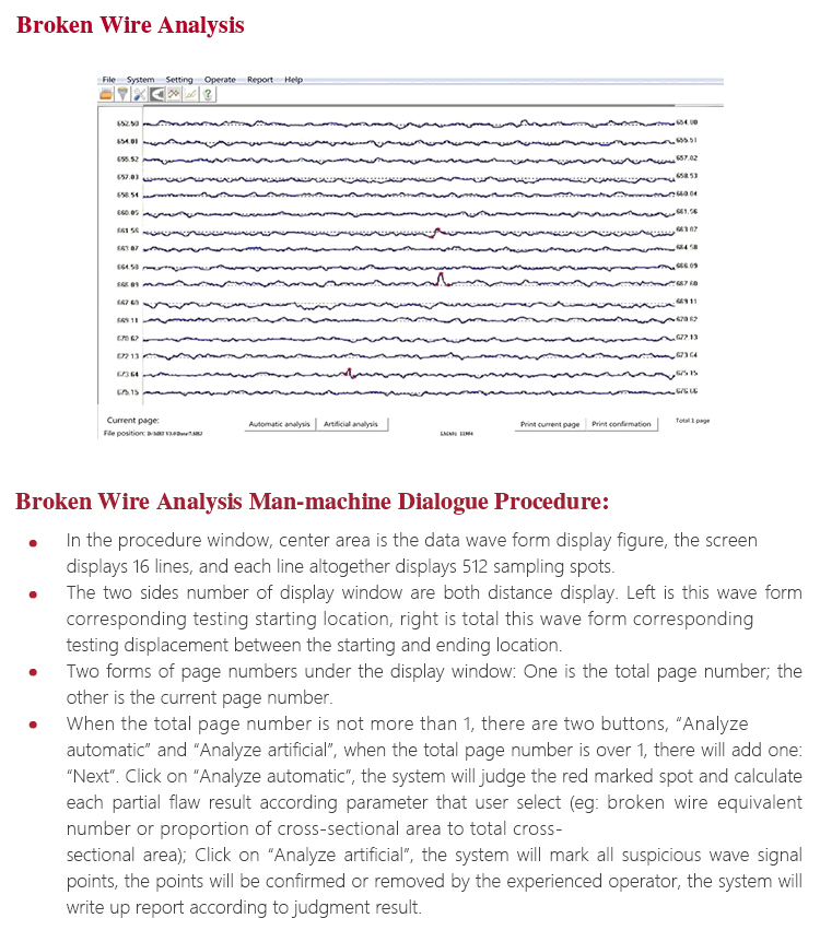 l Adopts electromagnetic qualitative, quantitative and orientation methods to do online overall NDT of broken wires, corrosion, wear, metal, loose strands, jump wire cross-sectional area, deformation and material anomalies of wire rope.