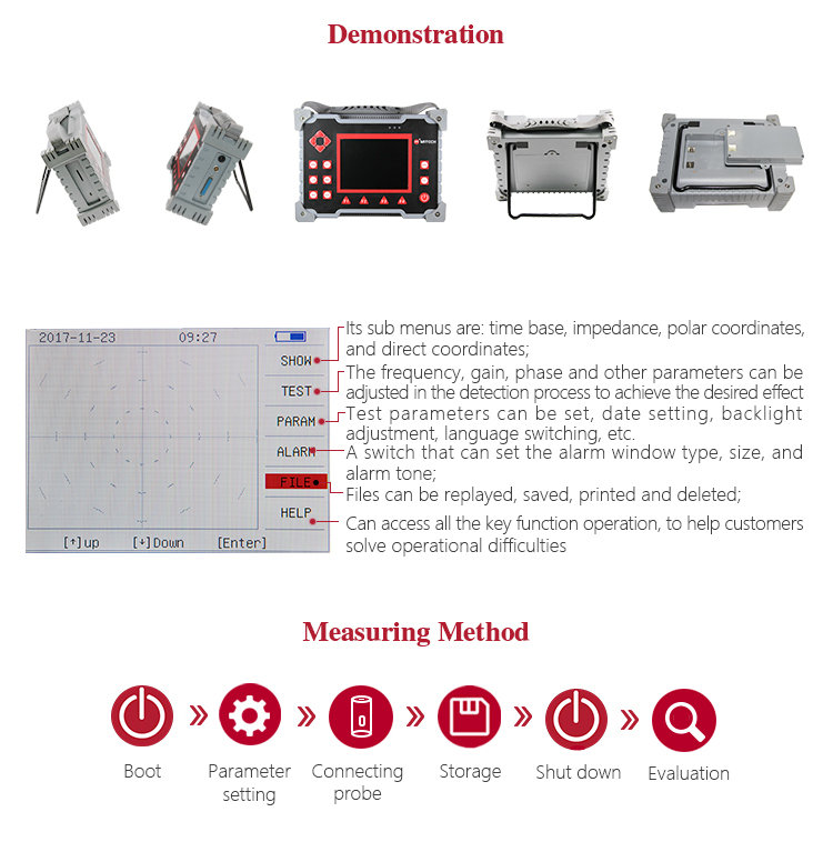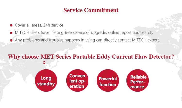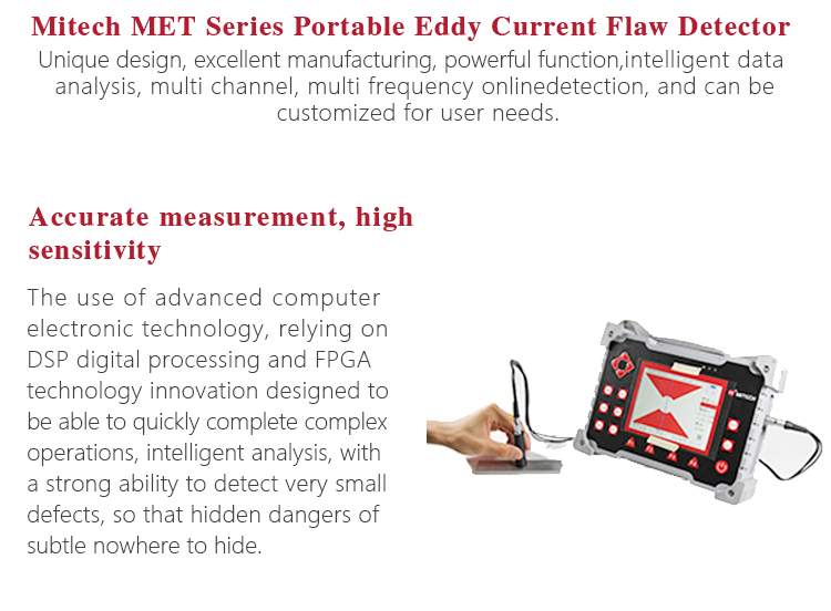 Mitech MET Series Portable Eddy Current Flaw Detector,also known as digital electromagnetic detecor,based on the principle of electromagnetic induction,can detect various metal parts surface or near surface defects with high-speed. It uses advanced DSP digital processing and FPGA technology innovation designed, with 5.7-inch TFT LCD screen, can clearly display the detection data.The product has high sensitivity, stable performance, multi-channel simultaneous detection and intelligent data analysis, can be equipped with intelligent probe, can also be customized probe according to customer needs , with extended magnetic memory, coating thickness, conductivity measurement and other practical Features. It is widely used in all kinds of metal pipe rods, auto parts, bearings, oil casing, oil control rods, ring metal parts in non-destructive testing and scientific research and other areas of higher education research.It is the necessary professional precision testing equipment to improve production efficiency, saving production costs.