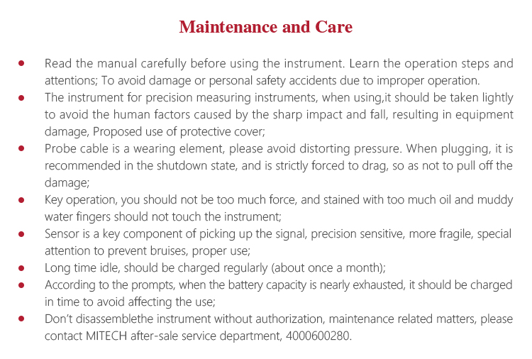 l Don’t disassemblethe instrument without authorization, maintenance related matters, please contact MITECH after-sale