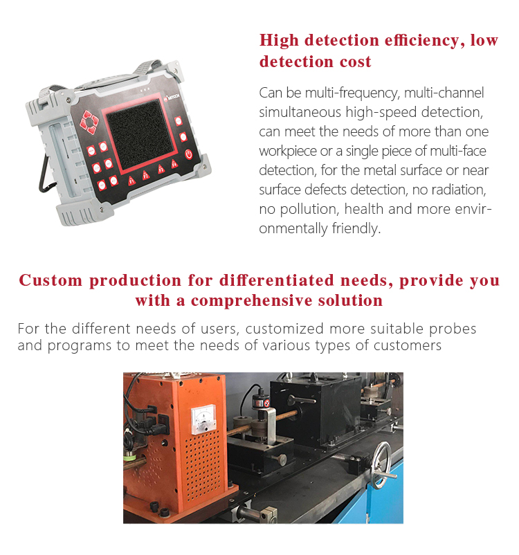 Mitech MET Series Portable Eddy Current Flaw Detector,also known as digital electromagnetic detecor,based on the principle of electromagnetic induction,can detect various metal parts surface or near surface defects with high-speed. It uses advanced DSP digital processing and FPGA technology innovation designed, with 5.7-inch TFT LCD screen, can clearly display the detection data.The product has high sensitivity, stable performance, multi-channel simultaneous detection and intelligent data analysis, can be equipped with intelligent probe, can also be customized probe according to customer needs , with extended magnetic memory, coating thickness, conductivity measurement and other practical Features. It is widely used in all kinds of metal pipe rods, auto parts, bearings, oil casing, oil control rods, ring metal parts in non-destructive testing and scientific research and other areas of higher education research.It is the necessary professional precision testing equipment to improve production efficiency, saving production costs.
