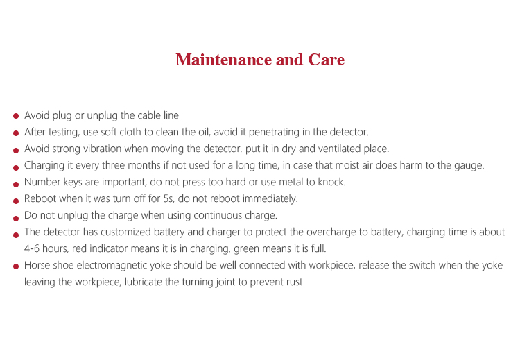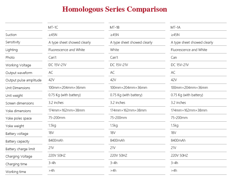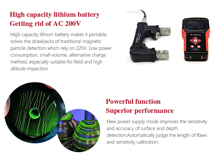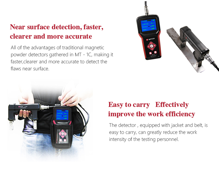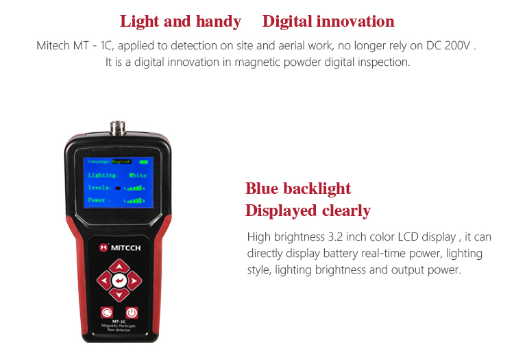 MT-1C magnetic particle flaw detector adopts high-capacity lithium battery pack, can convert DC to AC through variable-frequency, provide magnetic powder flaw detector with magnetic power supply. With low power consumption, it can continuous work for more than four hours after charging. It is especially proper for working in the wild and aerial area.