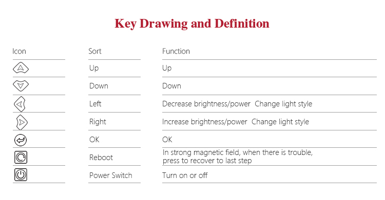 l Adjustable illumination brightness and working power can meet different testing demand and save the setting.