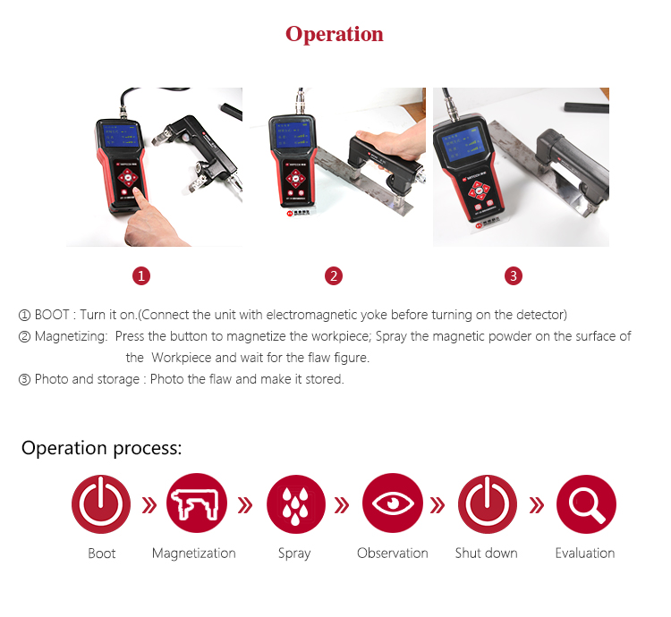 l When making dry powder detection, put the powder on the workpiece, move the yoke with 40mm/s, make sure they are well connected, observe whether the powder is pile up.