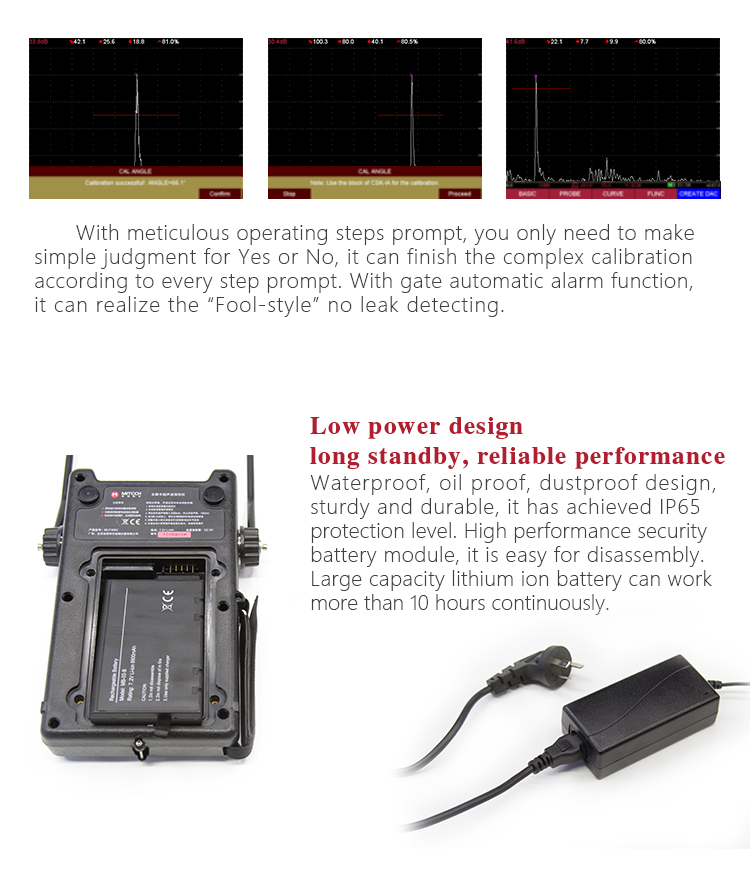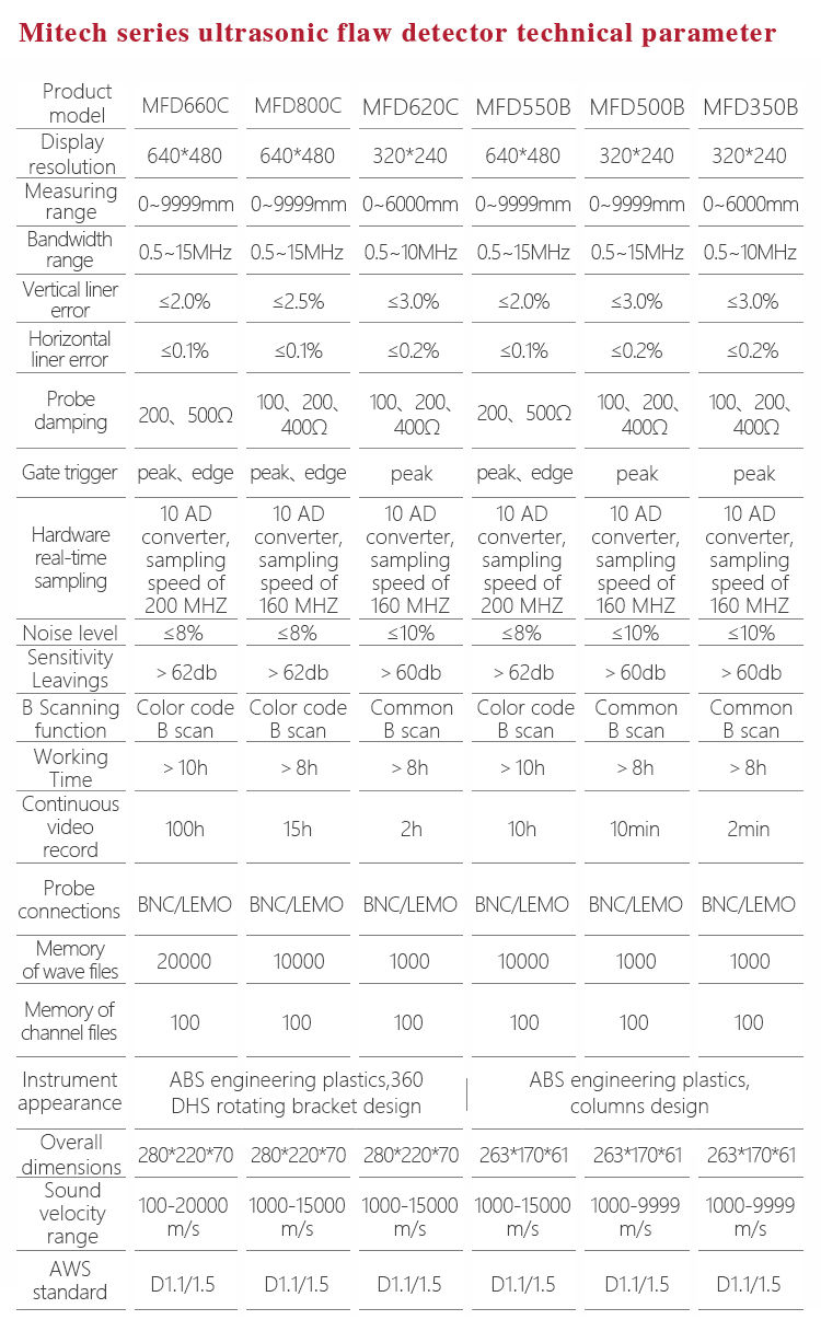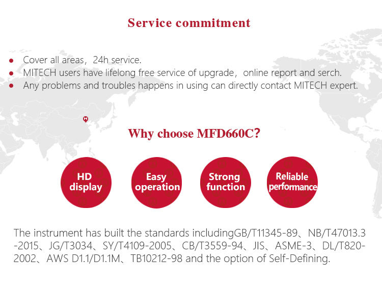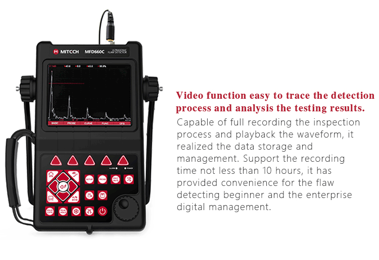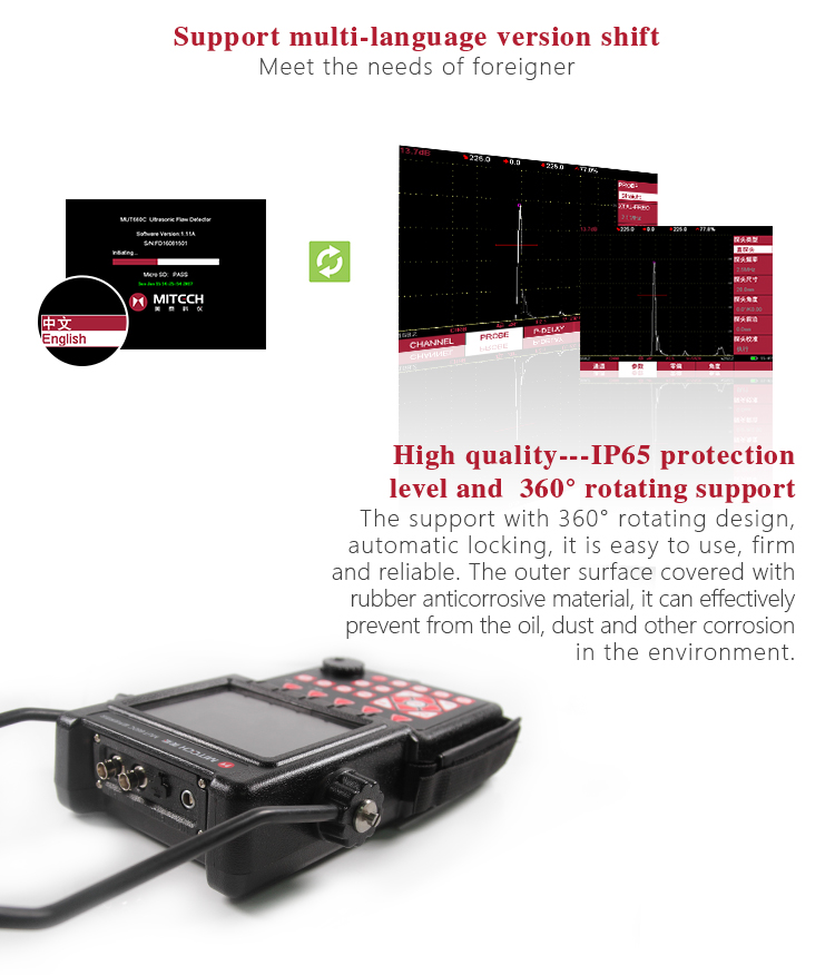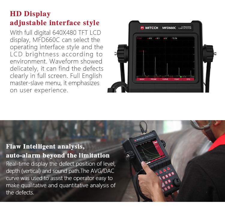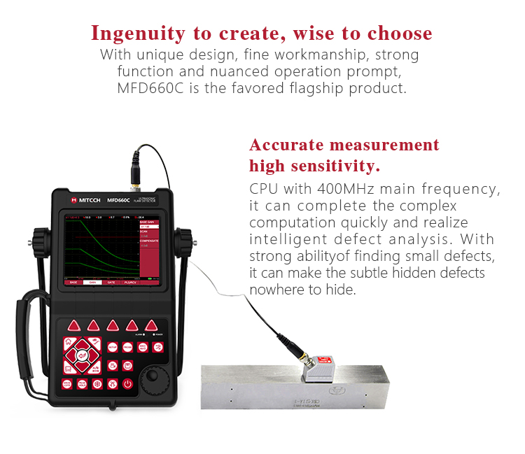 MFD660C intelligent digital ultrasonic flaw detector, Mitech concentrated years meticulously developed premium product, has a lot of advantages like unique design, sophisticated manufacturing, convenient operation, powerful function. It had received customers' favored since its inception. It can test, orient, evaluate and diagnose various flaws such as crack, lard, air hole in workpiece’s interior swiftly and accurately without any destruction. With full digital 640X480 TFT LCD display, it can select the operating interface style and the LCD brightness according to environment. With humanizing interface design, the waveform show delicately. It can find the defects clearly in full screen. Single hand capable for holding operation, the curve making, probe calibration and other conventional operation can be completed automatically. Core processor CPU with 400M main frequency, it can complete the complex run quickly and realize intelligent defect analysis. Low power design with large capacity and high performance lithium ion battery module, it can work more than 10 hours continuously. Full English master-slave menu, emphasizing on user experience, collecting shortcut keys, digital shuttle rotary wheel, cross menu three operating ways in one body, customers with different habits can operate it freely. It supports many languages. Its waterproof, oil proof, dustproof function can achieve IP65 protection level. It is the necessary professional precision instrument for defect detection, quality control, on-line safety monitoring and life evaluation in fields of oil, chemical, metallurgy, shipbuilding, aviation, railways and so on.
