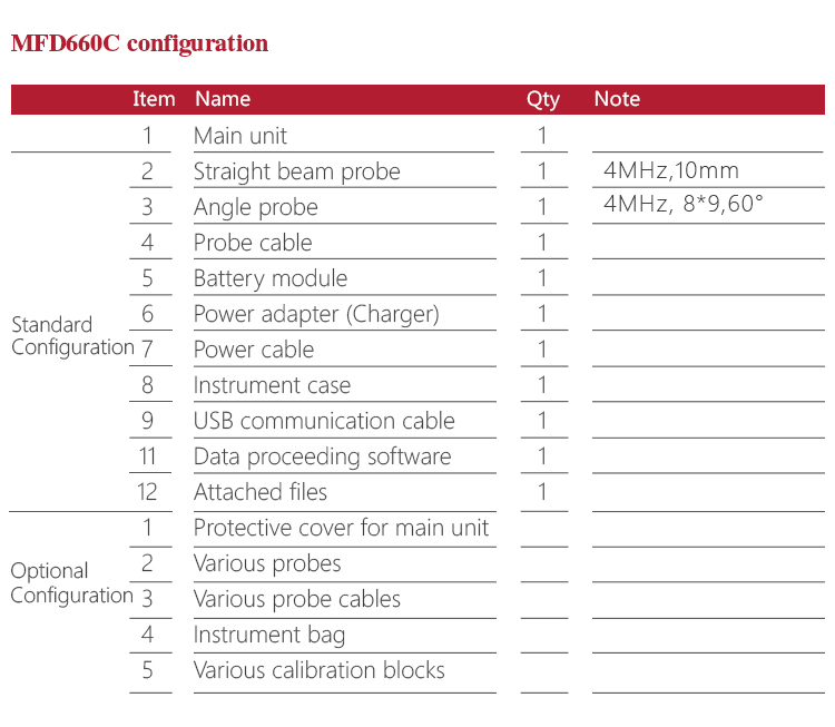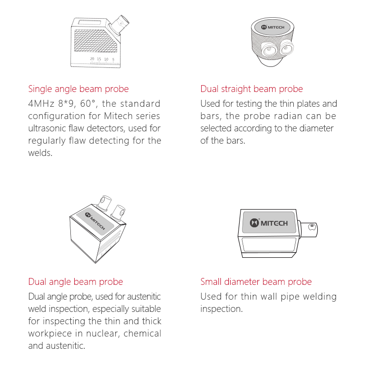 Probe Type | straight beam probe, angle beam probe, dual element probe, through-transmit probe |