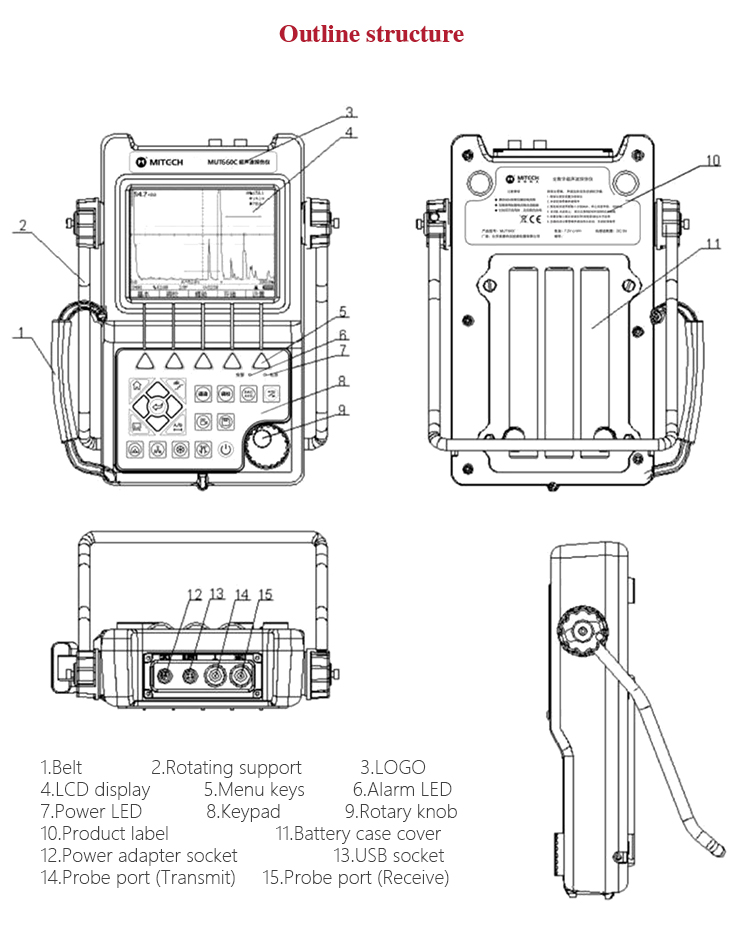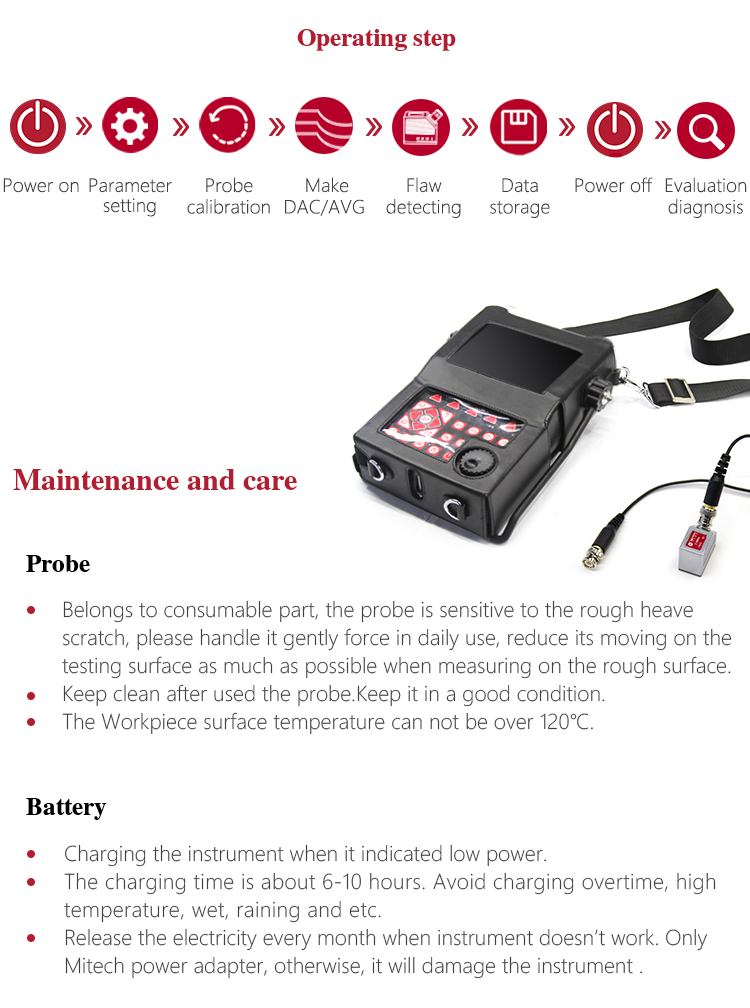 The battery for B series ultrasonic flaw detector is the rechargeable Li-ion battery pack rated 7.2V at 8800 mAh, which belongs to the standard configuration for Mitech B series ultrasonic flaw detectors. During using, please don’t disassemble the battery pack by yourself and use only with our special power adaptor for charging. Otherwise, it will cause damage to the battery and instrument. If it’s not used for a long time, make sure to do regularly charging and discharging about one time per month to avoid failure. | |