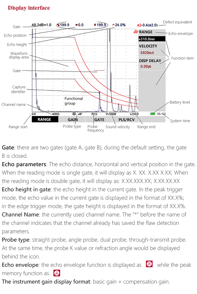 Gate position, gate width and gate height can be adjustable at will. The B gate can chose to set wave-getting alarm OR wave-losing alarm. The beep in gate and LED light can be alarmed or closed (the LED light alarm is very effective under the noise environment). The capture mark function can show the captured echo characteristics in the gate.