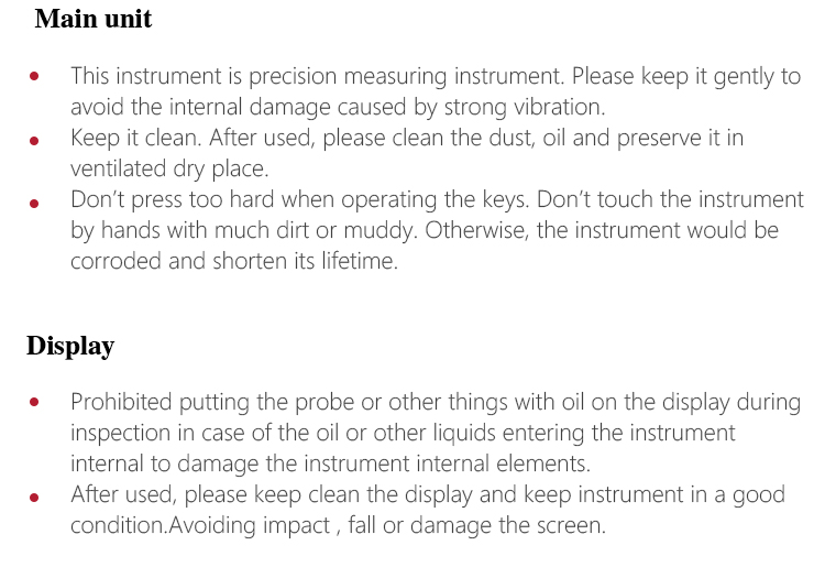 4. Please avoid oil, water or other liquids into the instrument and clean the instrument surface regularly.
