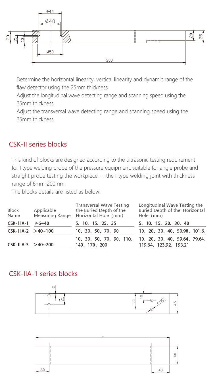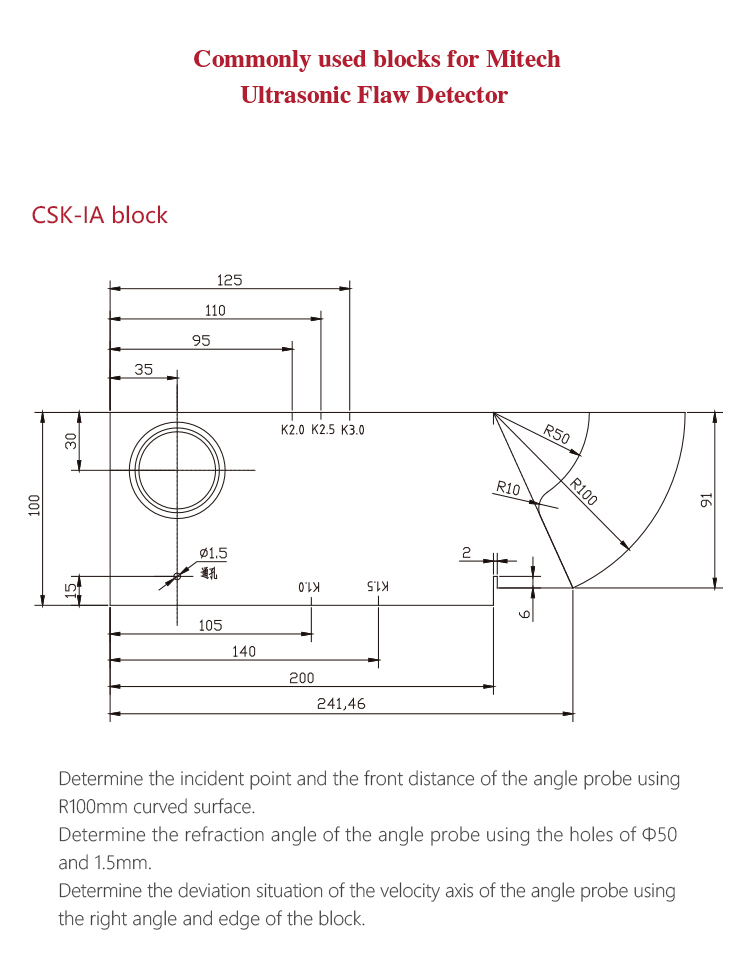 Mitech standard Ultrasonic flaw detector Angle Probe with the parameters of 4MHz 8*9, 60°is the standard configuration. It is mainly composed of the piezoelectric crystal, damping block and wedge. The ultrasonic wave emitted from the crystal, through the wedge, it is converted to the transverse wave, and then incident to the measured workpiece. The wedge is made of organic glass, which can realize the waveform transformation. In order to avoid errors in calculating the defect distance, before using the angle probe, we need to calibrate its P-delay, angle and forefront. Through calibration, this part of the error can be automatically subtracted, thus improving the measurement accuracy .The Angle Beam Probe is suitable for normal flaw detecting like welds. | |