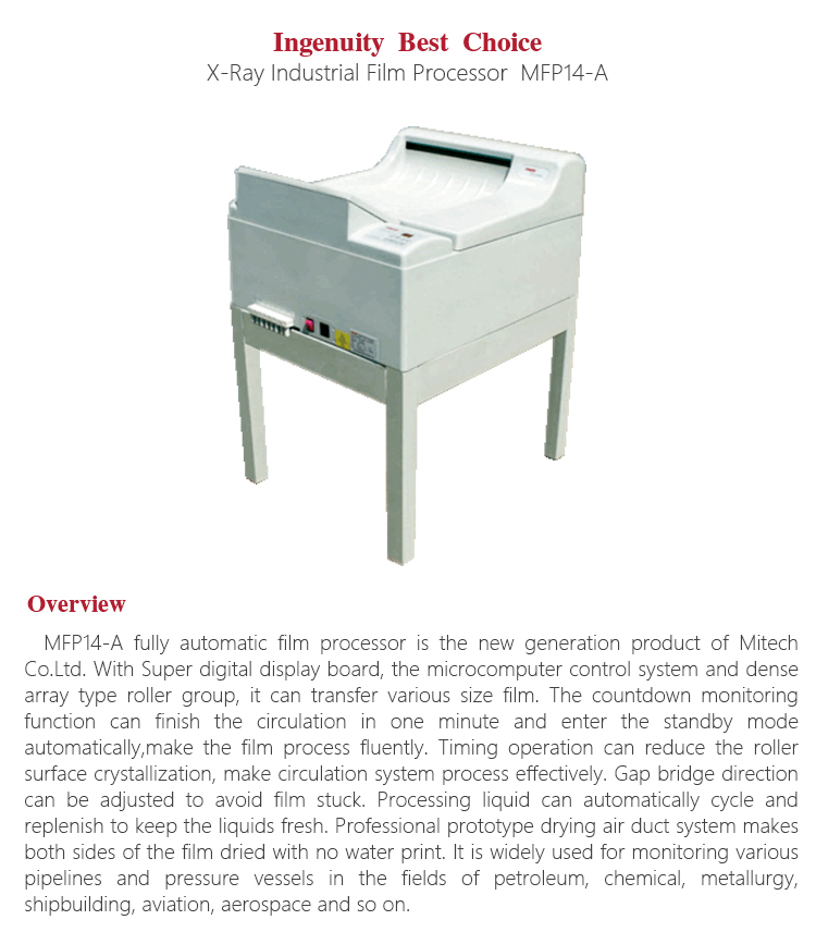MFP14-A fully automatic film processor is the new generation product of Mitech Co.Ltd. With Super digital display board, the microcomputer control system and dense array type roller group, it can transfer various size film. Gap bridge direction can be adjusted to avoid film stuck. Processing liquid can automatically cycle and replenish to keep the liquids fresh. Professional prototype drying air duct system makes both sides of the film dried with no water print. It is widely used for monitoring various pipelines and pressure vessels in the fields of petroleum, chemical, metallurgy, shipbuilding, aviation, aerospace and so on