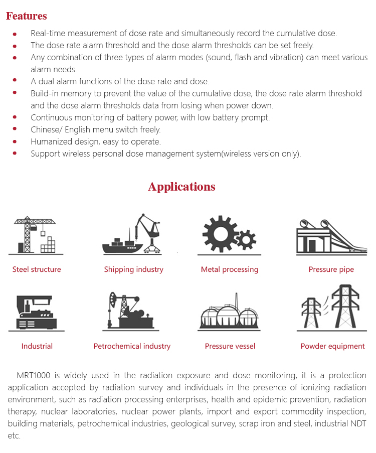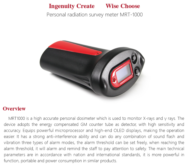 MRT1000 is a high accurate personal dosimeter which is used to monitor X-rays and γ rays. The device adopts the energy compensated GM counter tube as detector, with high sensitivity and accuracy. Equips powerful microprocessor and high-end OLED displays, making the operation easier. It has a strong anti-interference ability and can do any combination of sound, flash and vibration three types of alarm modes, the alarm threshold can be set freely, when reaching the alarm threshold, it will alarm and remind the staff to pay attention to safety. The main technical parameters are in accordance with nation and international standards, it is more powerful in function, portable and power consumption in similar products.