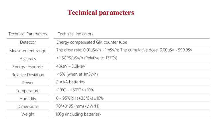 Measurement Range The dose rate: 0.01μSv/h~1mSv/h; The cumulative dose: 0.00μSv~999.9Sv