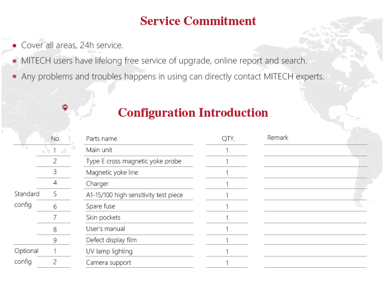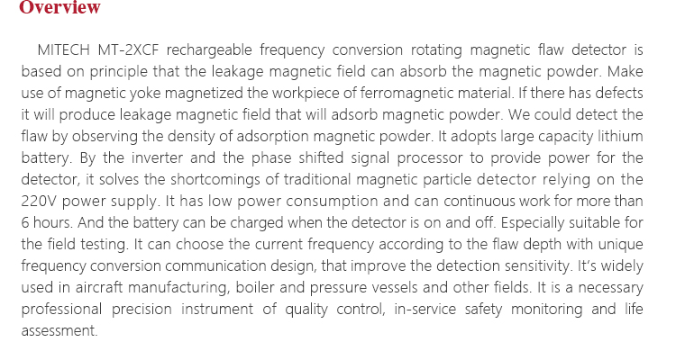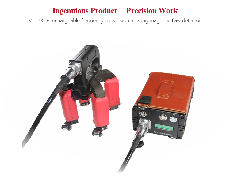 MITECH MT-2XCF rechargeable frequency conversion rotating magnetic flaw detector is based on principle that the leakage magnetic field can absorb the magnetic powder. Make use of magnetic yoke magnetized the workpiece of ferromagnetic material. If there has defects it will produce leakage magnetic field that will adsorb magnetic powder. We could detect the flaw by observing the density of adsorption magnetic powder. It adopts large capacity lithium battery. By the inverter and the phase shifted signal processor to provide power for the detector, it solves the shortcomings of traditional magnetic particle detector relying on the 220V power supply. It has low power consumption and can continuous work for more than 6 hours. And the battery can be charged when the detector is on and off. Especially suitable for the field testing. It can choose the current frequency according to the flaw depth with unique frequency conversion communication design, that improve the detection sensitivity. It’s widely used in aircraft manufacturing, boiler and pressure vessels and other fields. It is a necessary professional precision instrument of quality control, in-service safety monitoring and life assessment.