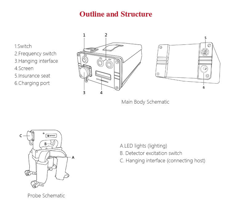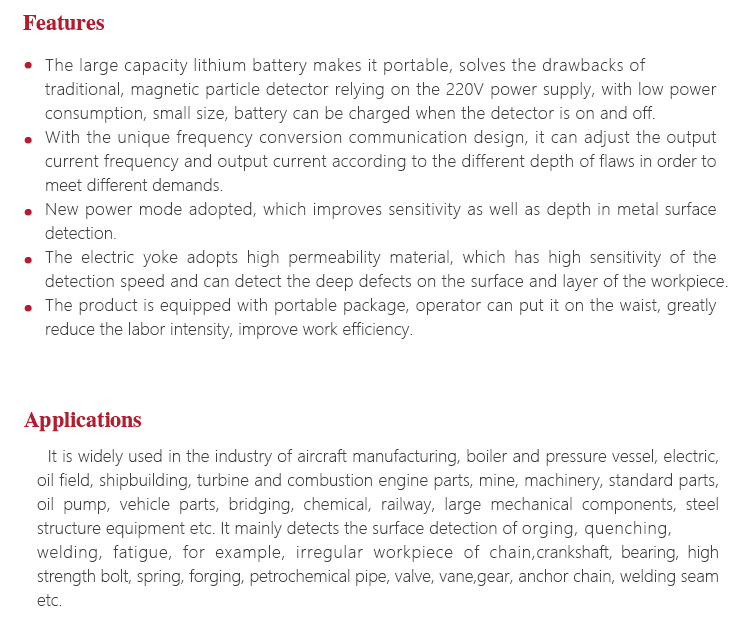 l The large capacity lithium battery makes it portable, solves the drawbacks of traditional, magnetic particle detector relying on the 220V power supply, with low power consumption, small size, battery can be charged when the detector is on and off.