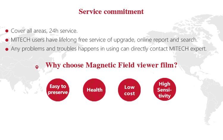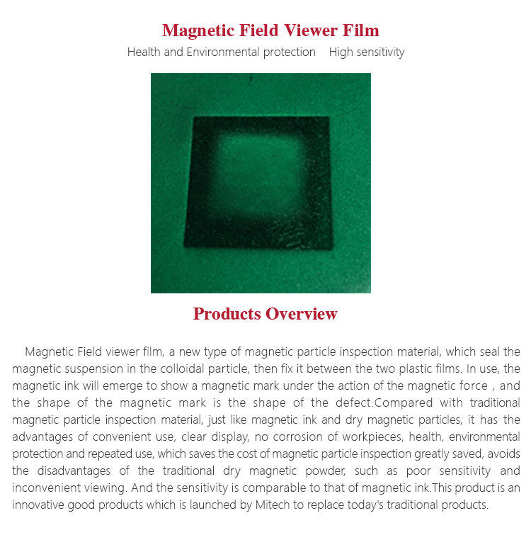 Magnetic Field viewer film, a new type of magnetic particle inspection material, which seal the magnetic suspension in the colloidal particle, then fix it between the two plastic films. In use, the magnetic ink will emerge to show a magnetic mark under the action of the magnetic force , and the shape of the magnetic mark is the shape of the defect.Compared with traditional magnetic particle inspection material, just like magnetic ink and dry magnetic particles, it has the advantages of convenient use, clear display, no corrosion of workpieces, health, environmental protection and repeated use, which saves the cost of magnetic particle inspection greatly saved, avoids the disadvantages of the traditional dry magnetic powder, such as poor sensitivity and inconvenient viewing. And the sensitivity is comparable to that of magnetic ink.This product is an innovative good products which is launched by Mitech to replace today's traditional products.