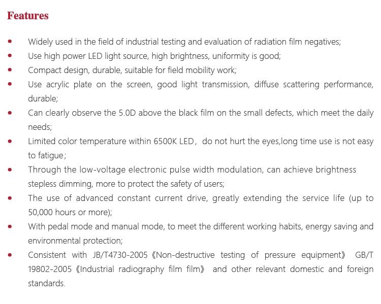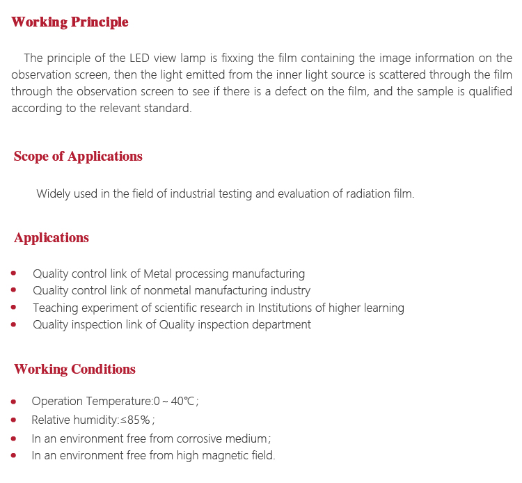The principle of the LED view lamp is fixxing the film containing the image information on the observation screen, then the light emitted from the inner light source is scattered through the film through the observation screen to see if there is a defect on the film, and the sample is qualified according to the relevant standard