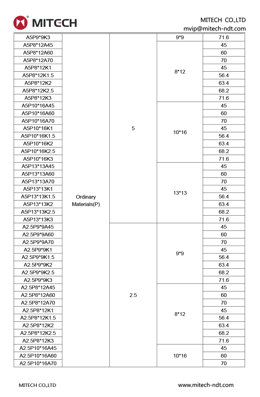Mitech ultrasonic Angle Beam probe, choice superior performance of the piezoelectric material chip, damping block and protective film. Strong penetration, high signal to noise ratio, has good wear resistance, excellent near surface resolution, smaller scattering noise. The key manufacturing processes using special equipment and fixtures, as far as possible to exclude the impact of human factors.We can provide high-quality customized solutions to meet the special needs of customers. Angle beam probe is suitable for for welding and other conventional flaw detection, and widely used in a variety of pipe fittings, pressure vessels, axles and other manufacturing industries. Consistent with "EN12668-2" and other relevant standards at domestic and abroad, compatible with a variety of BNC (Q9),Microdot (L5) GB, American standard connector and LEMO-00 (C5), LEMO-1 (C9)and other European standard connector.