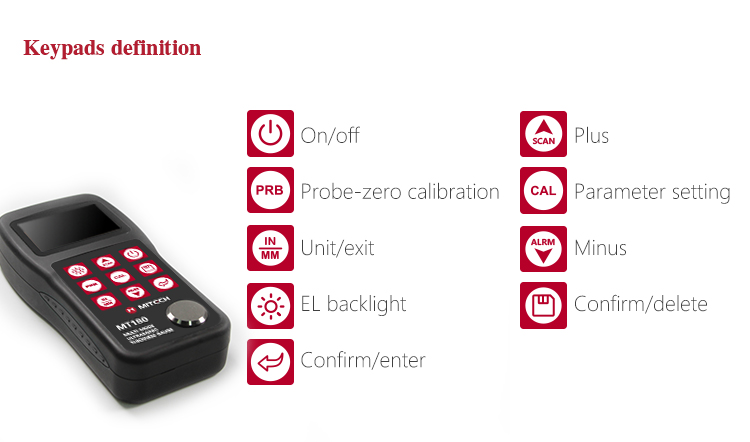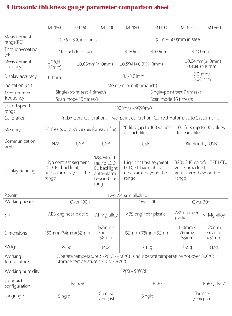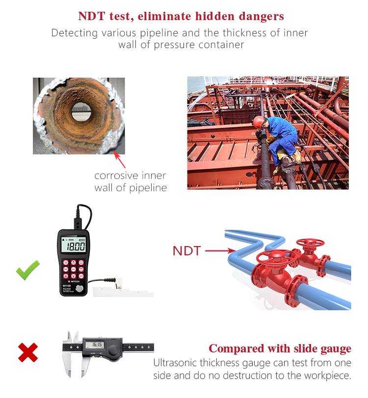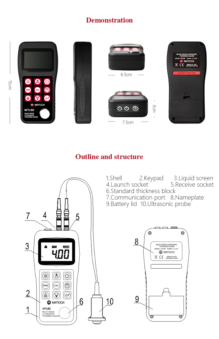 Miteh MT180 multi-mode ultrasonic thickness gauge, based on ultrasonic measuring principle, it can perform thickness measurements on a wide range of materials including metals, plastic, ceramics glass and other ultrasonic well-conductive materials. It is also capable for measuring the sound velocity of the object with known thickness. Compared with the traditional measurement method, the advantage of ultrasonic thickness gauge is that it can finish the measurement only if it contacts with one side of the measured workpiece. Its unique performance of capable for testing thickness through the coating provides efficient solution for testing the workpiece of coated surface or corrosion materials. It can test the workpiece directly without needing to get rid of the surface coating. It’s widely used for monitoring the production equipments’ various pipelines and pressure vessel corrosion reducing degree in the fields of petroleum, chemical, metallurgy, shipbuilding, aviation, aerospace and so on. It also can be used for making accurate measurement to various plates and machining parts. It is the necessary professional precision instrument for improving the production efficiency and qualification rate as well as saving cost.