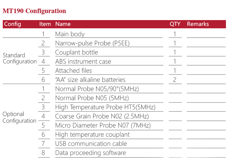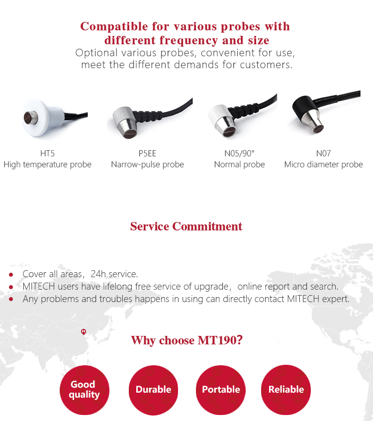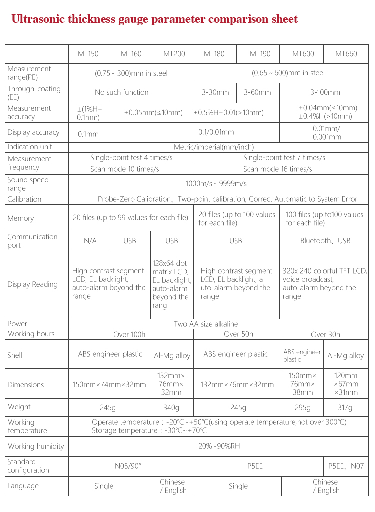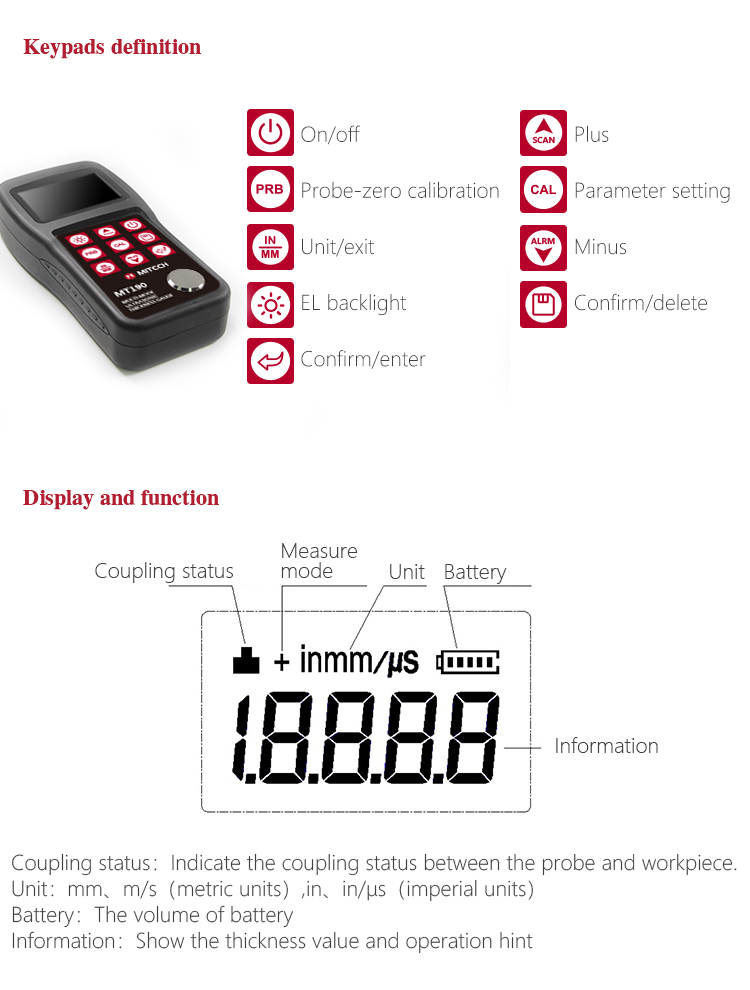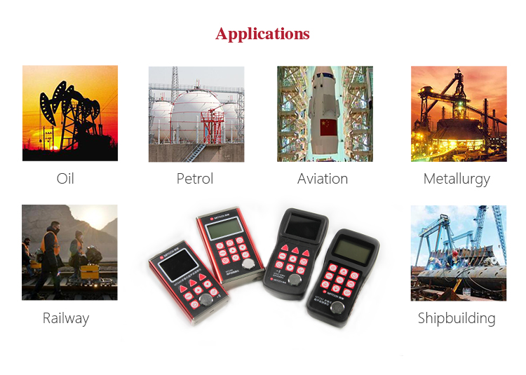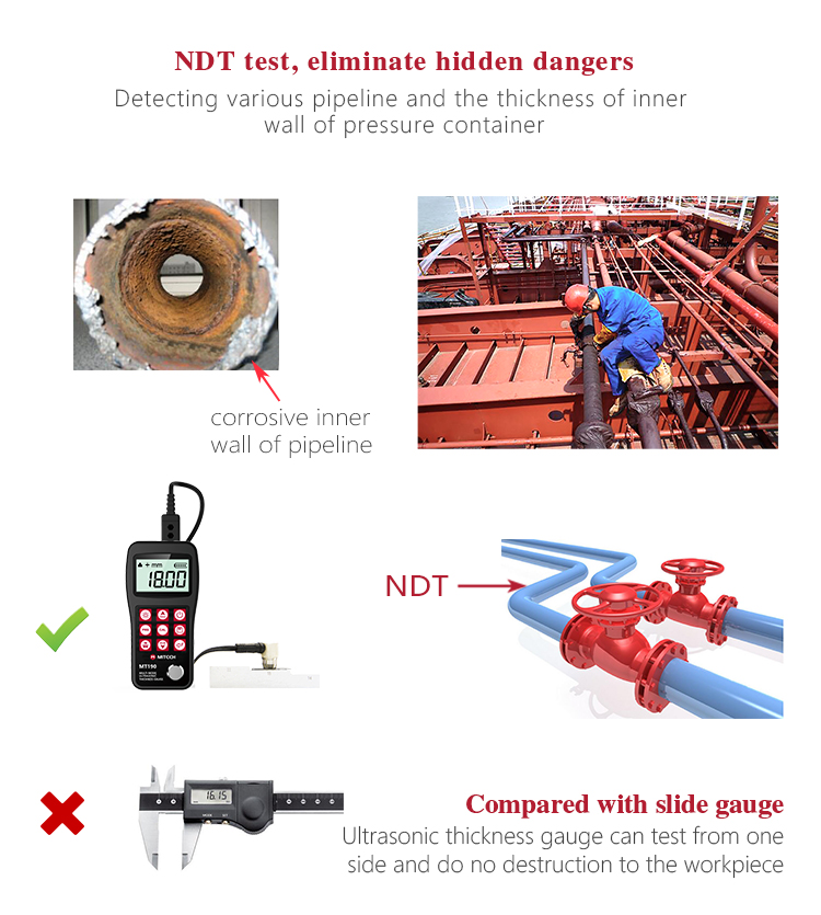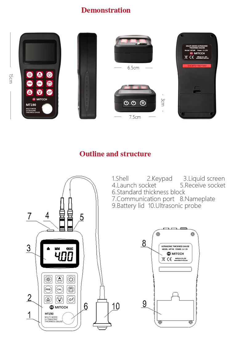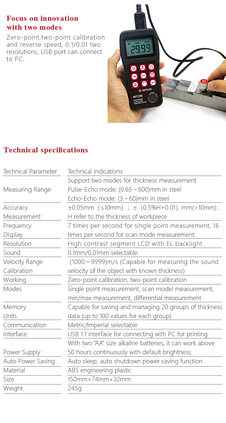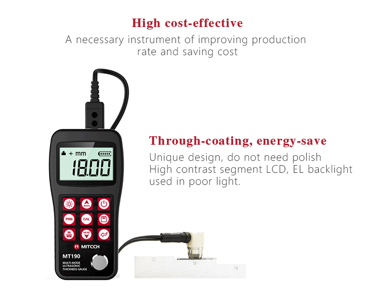 Miteh MT190 multi-mode ultrasonic thickness gauge, based on ultrasonic measuring principle, it can perform thickness measurements on a wide range of materials including metals, plastic, ceramics glass and other ultrasonic well-conductive materials. It is also capable for measuring the sound velocity of the object with known thickness. Compared with the traditional measurement method, the advantage of ultrasonic thickness gauge is that it can finish the measurement only if it contacts with one side of the measured workpiece. Its unique performance of capable for testing thickness through the coating provides efficient solution for testing the workpiece of coated surface or corrosion materials. It can test the workpiece directly without needing to get rid of the surface coating. It’s widely used for monitoring the production equipments’ various pipelines and pressure vessel corrosion reducing degree in the fields of petroleum, chemical, metallurgy, shipbuilding, aviation, aerospace and so on. It also can be used for making accurate measurement to various plates and machining parts. It is the necessary professional precision instrument for improving the production efficiency and qualification rate as well as saving cost.