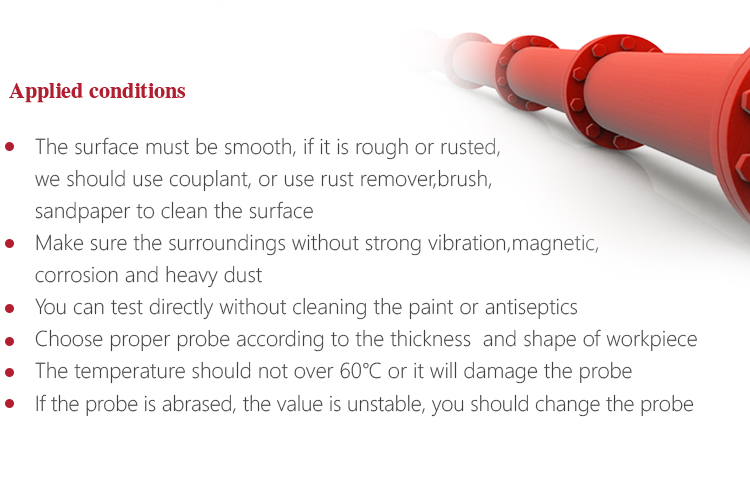 The velocity of sound through a substance is dependant upon its temperature. As materials heat up, the velocity of sound through them decreases. In most applications with surface temperatures less than about 100℃, no special procedures must be observed. At temperatures above this point, the change in sound velocity of the material being measured starts to have a noticeable effect upon ultrasonic measurement. At such elevated temperatures, it is recommended that the user perform a calibration procedure on a sample piece of known thickness, which is at or near the temperature of the material to be measured. This will allow the gauge to correctly calculate the velocity of sound through the hot material.