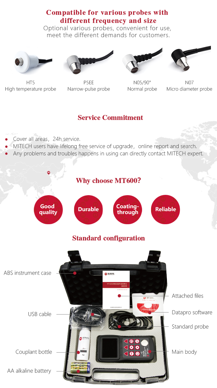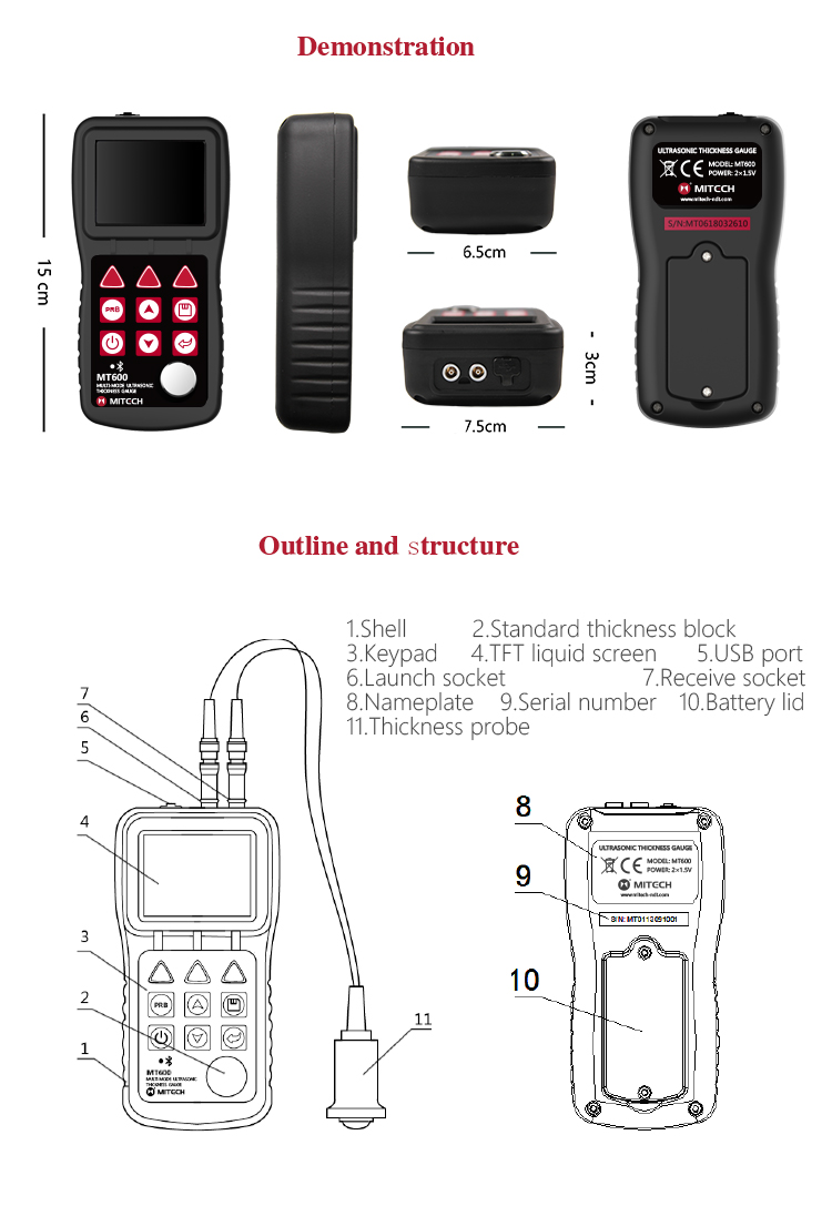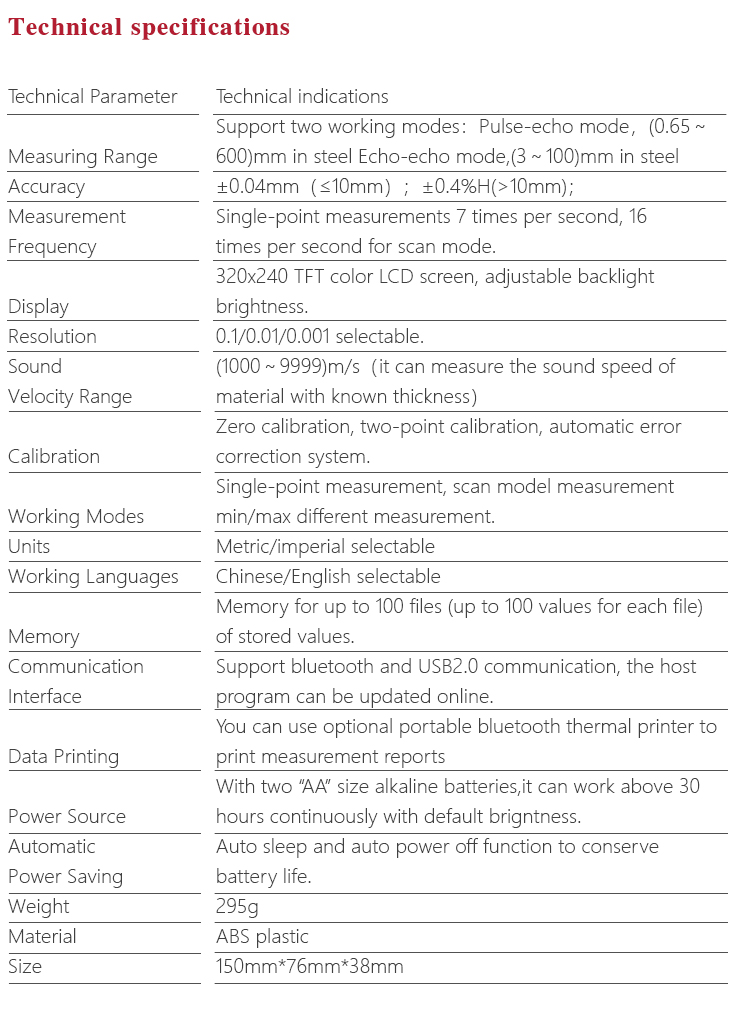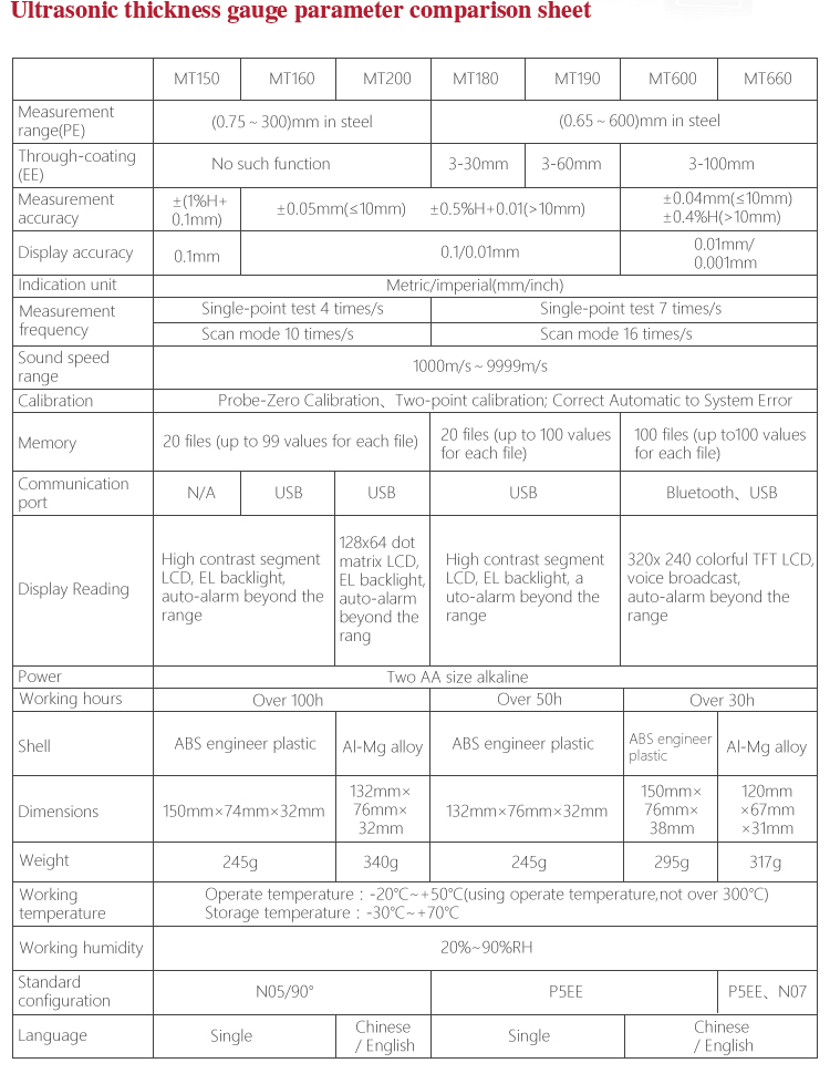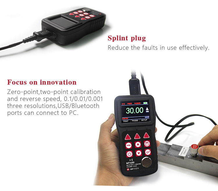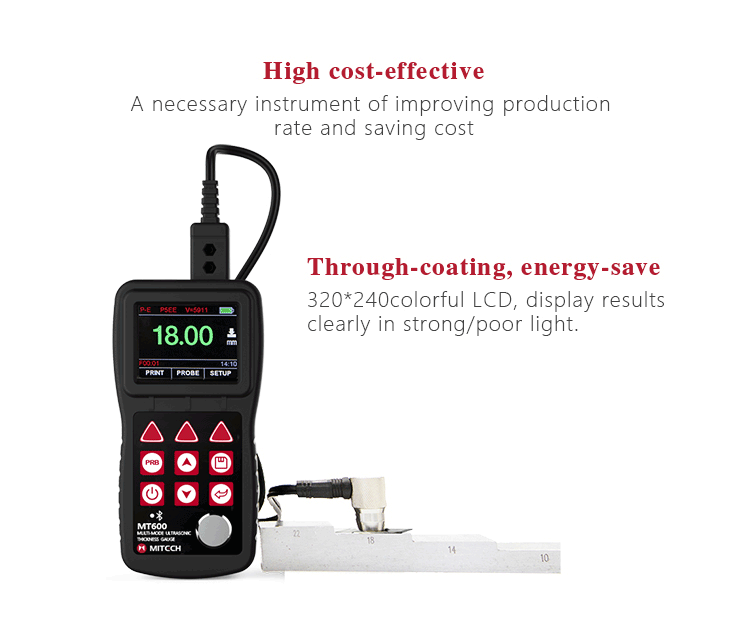 MT600 multi-mode ultrasonic thickness gauge is a upgraded product. We pay more attention to user experience and innovative features such as visual experience, protection grade, automatic alarm and etc..Color TFT display (320×240 TFT LCD) with adjustable backlight, allow the user to work at worksites with low visibility. IP65 degree of protection, can effectively prevent harsh field environments of oil, dust and other corrosion. It also has voice broadcast function, automatic alarm., 0.1mm/0.01mm/0.001mm resolution, bluetooth communication and penetrate the coating mode and normal mode functions and etc.. It can measure the substrate thickness without the need to dispose of coating directly. Its unique non-destructive testing performance provide the perfect solution for the thickness testing of closed Pipes, containers, etc. It is widely used in petroleum, chemical, metallurgy, shipbuilding, aviation, aerospace and other fields because of monitoring corrosion thinning degree of various pipes and pressure vessels.It can also be used for precise measurement of sheet metal and machined parts. This professional precision instrument is to improve production efficiency and qualified rate, cost saving.