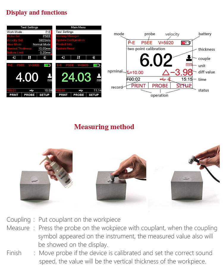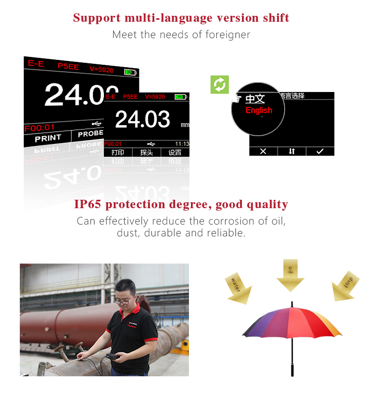 Multi-mode: Pulse-Echo mode (P-E mode) and Echo-Echo mode (E-E mode). In Echo-Echo mode, it can test the wall thickness eliminating paint or coating thickness.